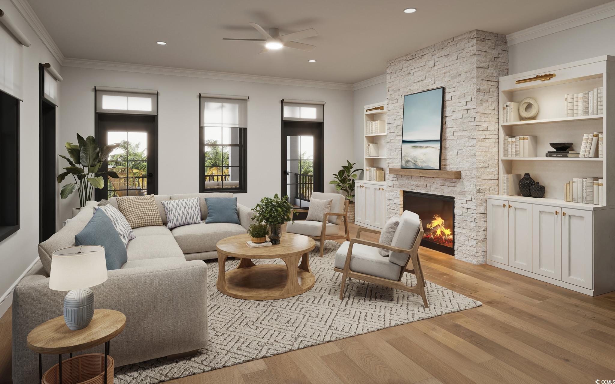 Welcome to Market Common; one of the only live/work designed communities along the Grand Strand. Market Common offers a variety of restaurants, local boutiques, entertainment, and service shops. All of these communal businesses are steps from the front door. The Atlantic Ocean is less than a mile away as well. This 3 bedroom 3.5 bathroom townhome overlooks the downtown Market Common area. The home is 3 stories high and boast porches on all levels. Inside you will find an elevator option to take you to all floors. There is an office/study on the first floor. Spending to much time with work; sleep in the sizeable bedroom with ensuite bath on the bottom floor. Take time off and enjoy your street side porch. Moving to the second floor you will be greeted with an open floor plan. Floors are a light hardwood, cabinets are white, and the quartz countertops complement the finishes. The living space is located on the second floor; gourmet kitchen with large pantry, formal dining area with kitchen nook, and a warm living space with impressive fireplace. The second floor has access to a porch with views of the downtown area and Valor Park. The master suite is on the 3rd floor giving amazing views of Market Common. In the luxurious master bathroom you will find a tiled shower, stand alone tub and decorative vanity. There is another bedroom with ensuite bathroom on the third floor and the laundry area. Other qualities of the home include 2 car garage, deluxe molding package, built in shelves option, and hardwood stairs.