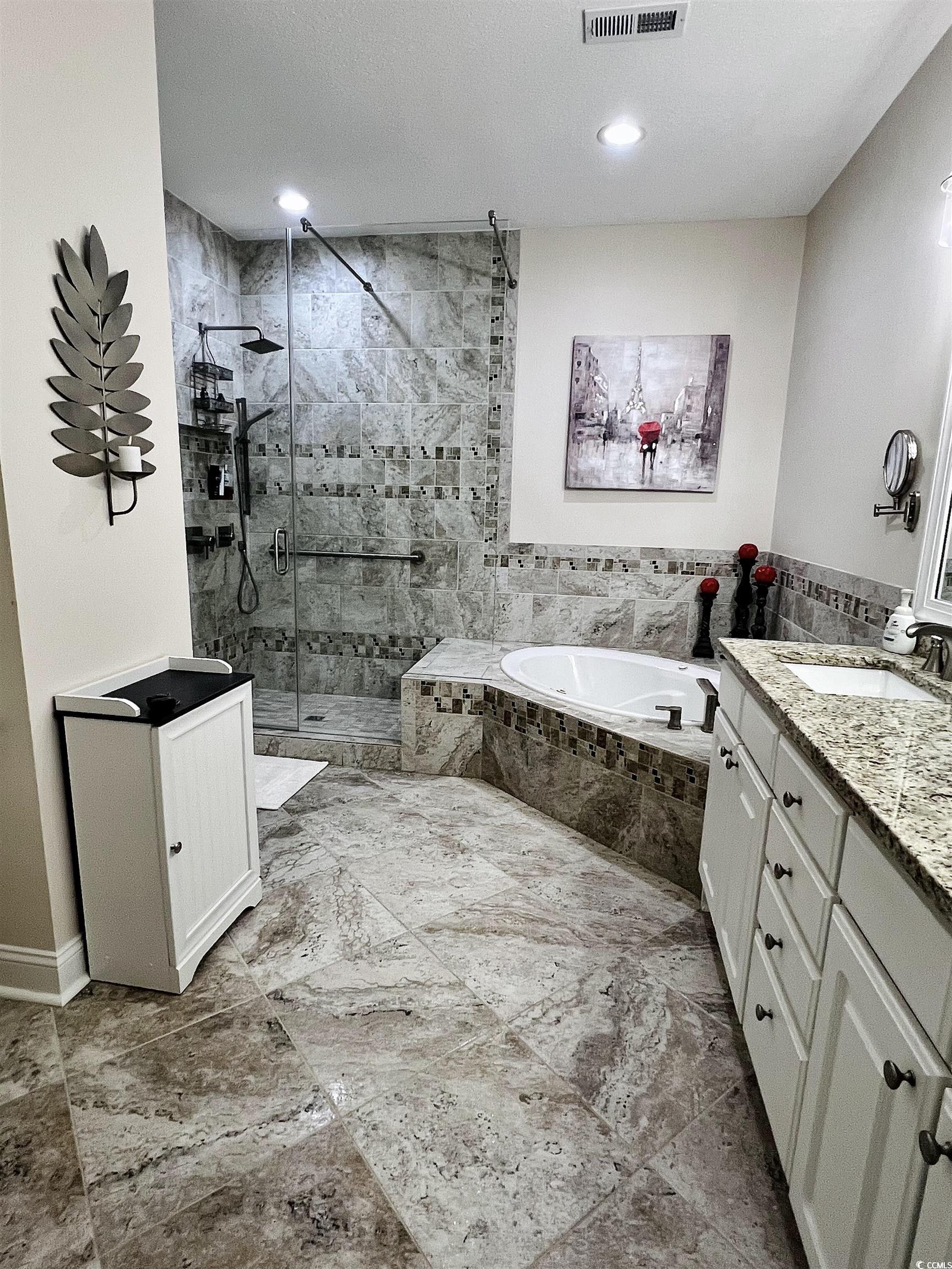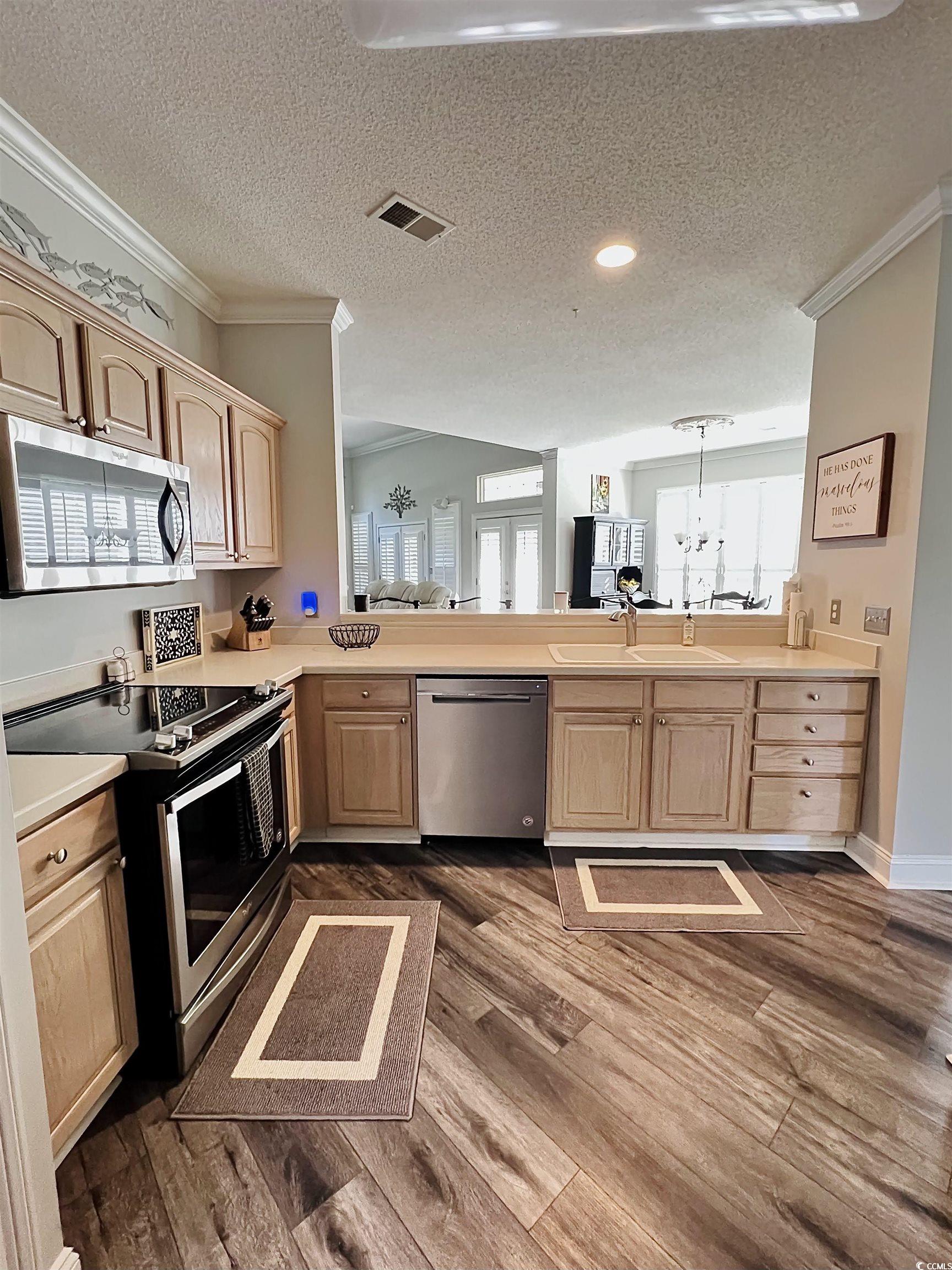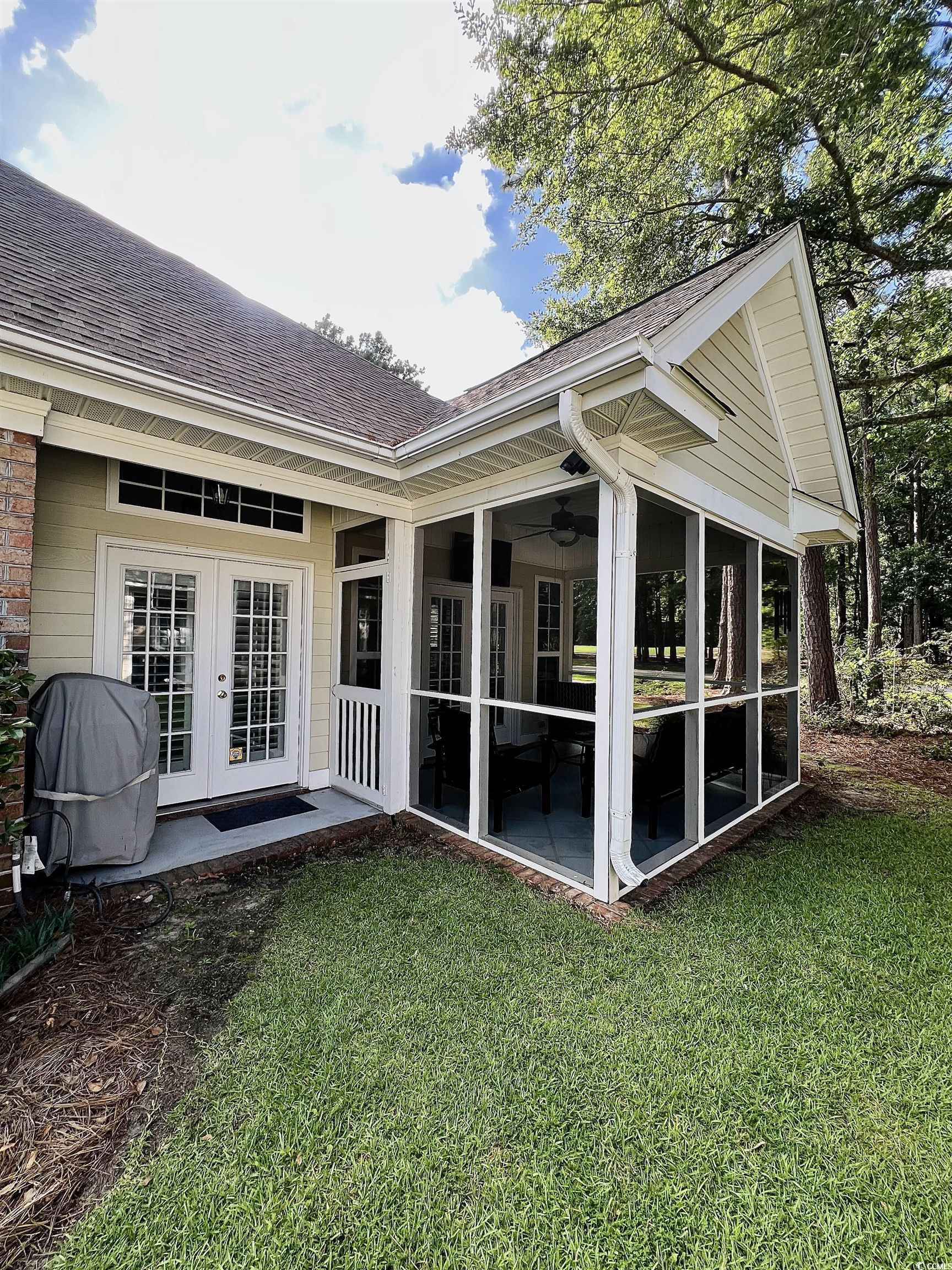 Must see this stunning, bright and airy golf villa located in the highly desirable Grand Villas at Wachesaw Plantation East! Tastefully updated with modern finishes from the LVP flooring to the 12 foot ceilings & soaring windows, clad with new plantation shutters! The flow of the open floorplan in this one-level villa allows for entertaining with ease and elegance. Kitchen has newer appliances and all convey with the sale, including pedestal washer & dryer. This villa is one of the larger floorplans with a spacious primary bedroom and two additional bedrooms, a screened porch and patio overlooking the second fairway. Attached, private, oversized 2 car garage also has a utility room with shelving. Community amenities include pool, tennis courts (+pickleball), miles of walking-fitness paths, fitness room and 24 hour security guard at gate. All exterior maintenance, pest control & insurance are included in HOA dues. Location is unbeatable: close to famous Murrells Inlet Marshwalk, Hospital, many medical providers, grocery store within a mile, Huntington State Park with its pristine natural beach and nationally acclaimed Brookgreen Gardens! Come, live the dream and embrace the Low Country Lifestyle!