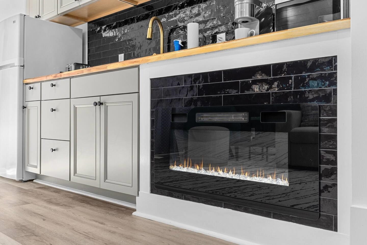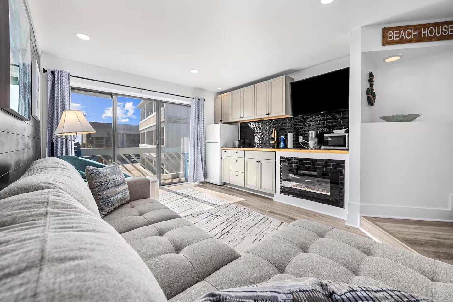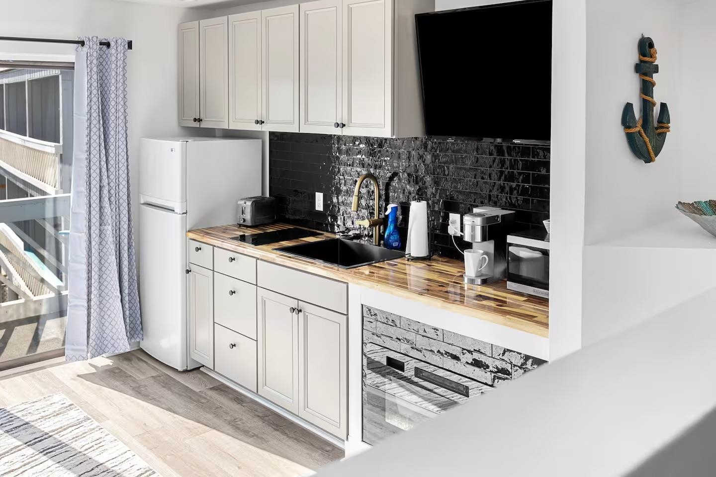 Turnkey and fully renovated 1 bedroom, 1 bath condo located in Whispering Sands in North Myrtle Beach! This beautifully updated unit features luxury vinyl plank flooring throughout and comes fully furnished for immediate enjoyment or rental use. The renovated bathroom showcases a modern tiled shower with elegant gold fixtures. The kitchenette is thoughtfully designed with a full-size refrigerator, dual-burner stovetop, butcher block countertops, and a striking black ceramic tile backsplash. The living area offers a cozy fireplace and opens to a private balcony, perfect for enjoying the coastal breeze. The bedroom is equipped with two queen size beds, maximizing comfort and flexibility. Whispering Sands community amenities include a private pool and convenient golf cart parking. Just one block from the ocean and close to dining, shopping, and local attractions, this condo is an ideal beach getaway, second home, or investment opportunity in the heart of North Myrtle Beach.