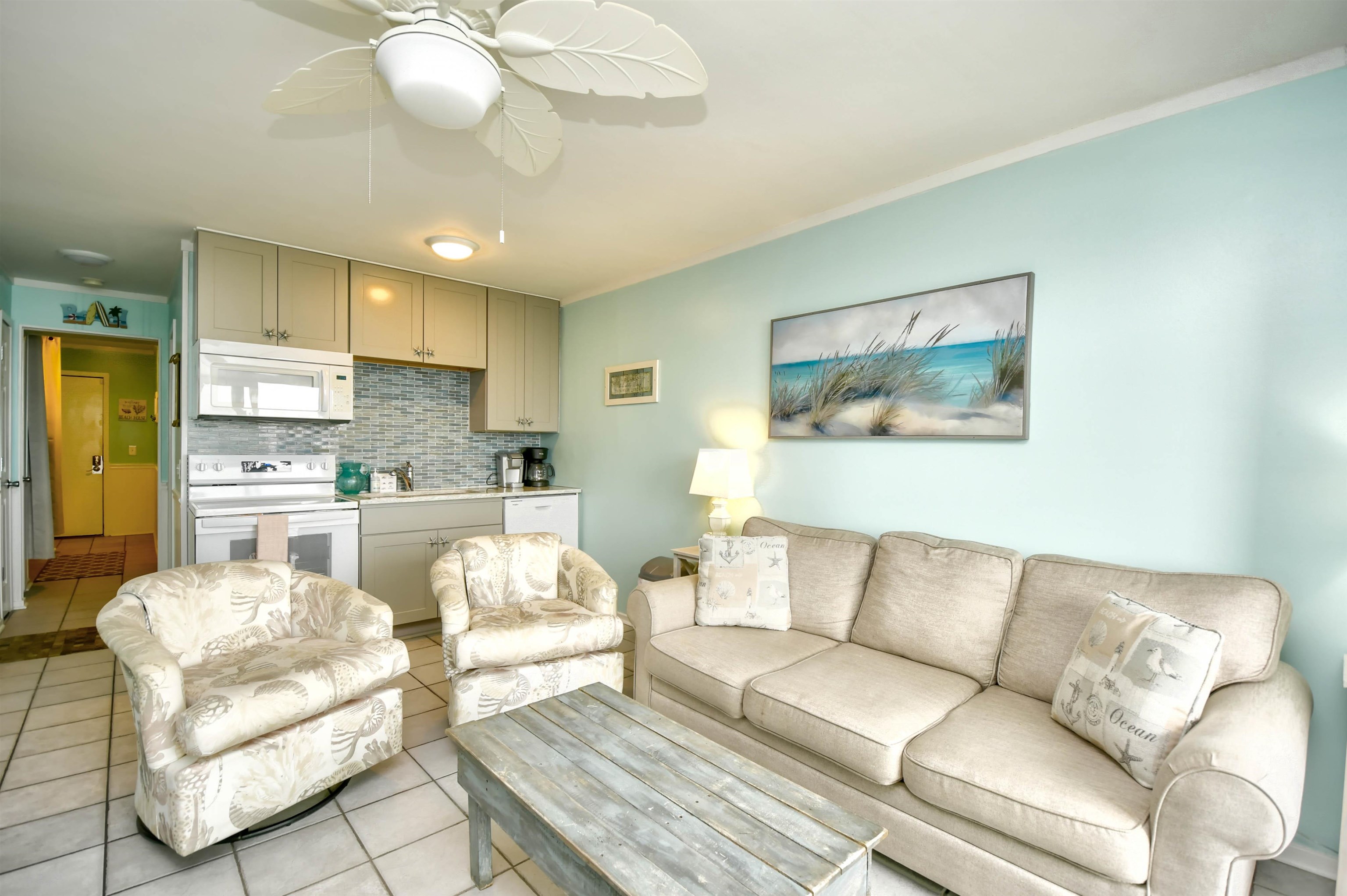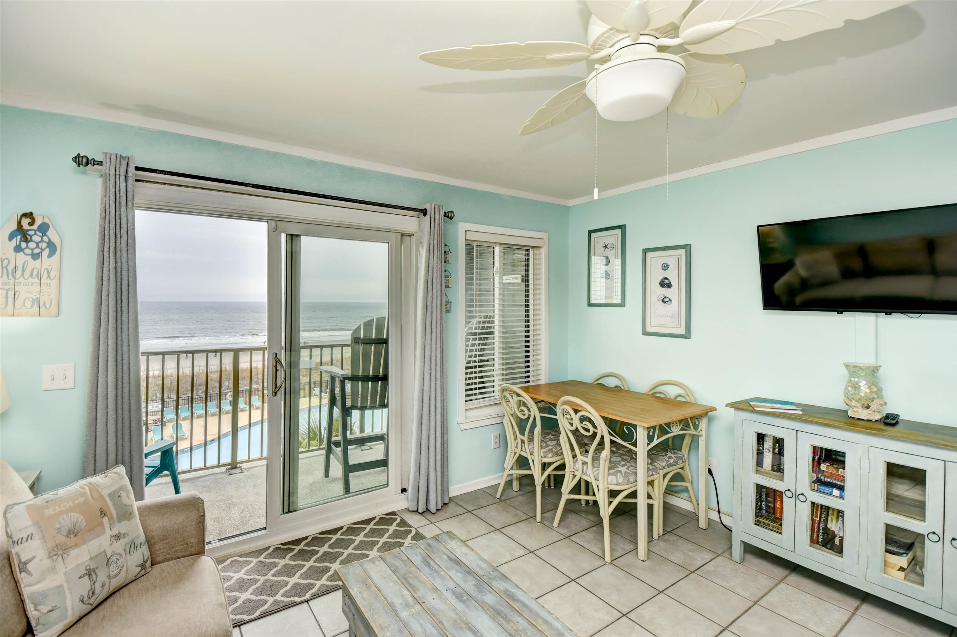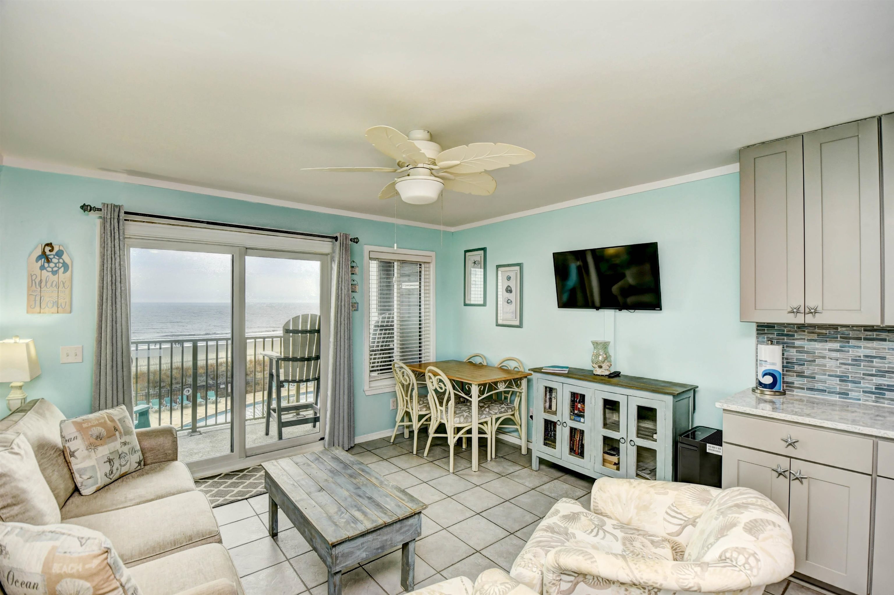 This is the one you’ve been waiting for! Don’t miss your chance to own a true oceanfront property in a sought-after gated, 33-acre community Myrtle Beach Resort just on the edges of Surfside Beach! Enjoy an incredible lineup of resort-style amenities, including indoor and outdoor pools, splash and spray areas, a lazy river, fitness center, tiki bar with live music, drinks and snacks, bocce ball, pickleball, tennis and basketball courts, playground, hot tub, sauna, putting green, and 24-hour security—plus so much more. Take in gorgeous pool views from your updated kitchen featuring quartz countertops and a beach-inspired glass backsplash. The condo comfortably sleeps six, with the built-in bunks always being a hit with the kidos! It’s a true one-bedroom layout—no walking directly into the bedroom or living room upon entry. Relax on your private balcony with a morning coffee or evening glass of wine while listening to the waves—they’re that close. Additional highlights include: HVAC system approximately 6 years; LVP flooring in bedroom; kitchen appliances 2025; Popcorn ceiling removed; bedroom furniture and mattress 2025; bunk mattresses 2025; 2025 Bathroom Vanity and light fixture; Ecobee smart thermostat with sensors on door (if door is open too long it will turn off the unit); UV germicidal lights (specifically UVC lights) added to the HVAC also 2025 Please note: no pets allowed on resort. This unit would be a great Beach or second home, or investment opportunity. It is ready for you to arrive and start enjoying the beach life right away!