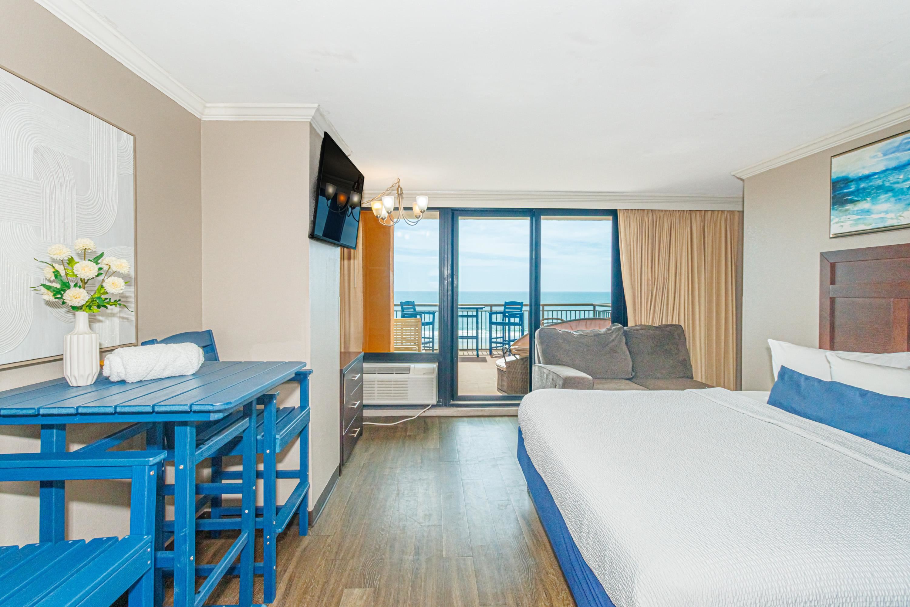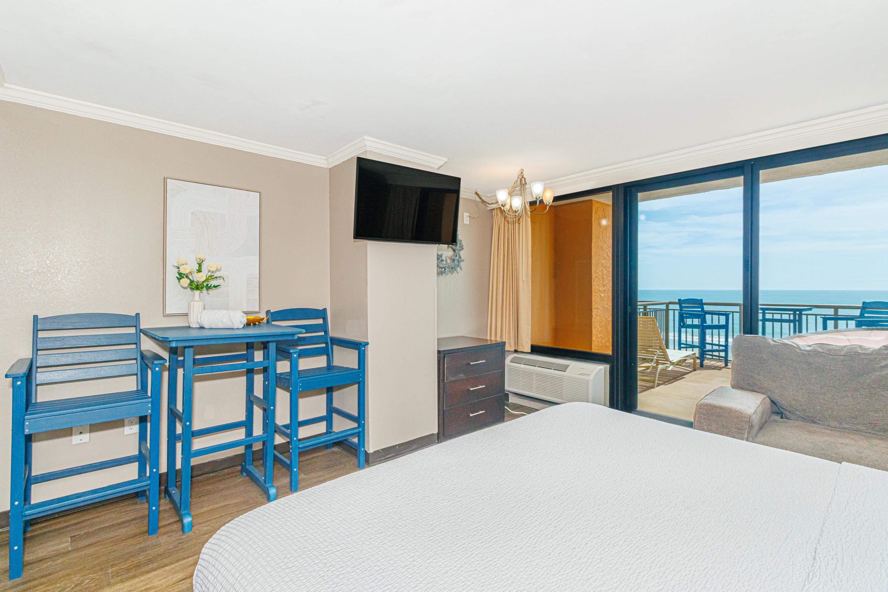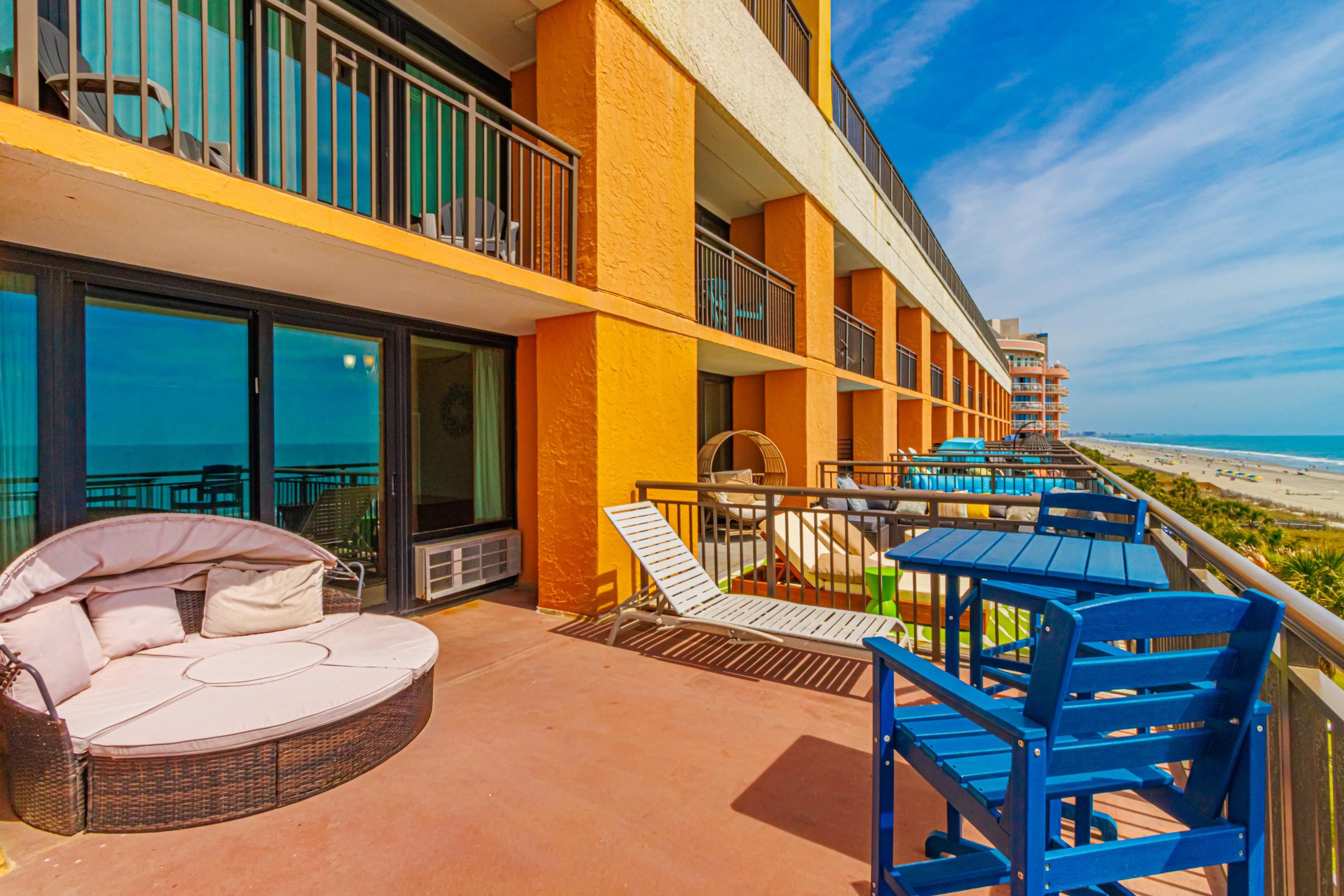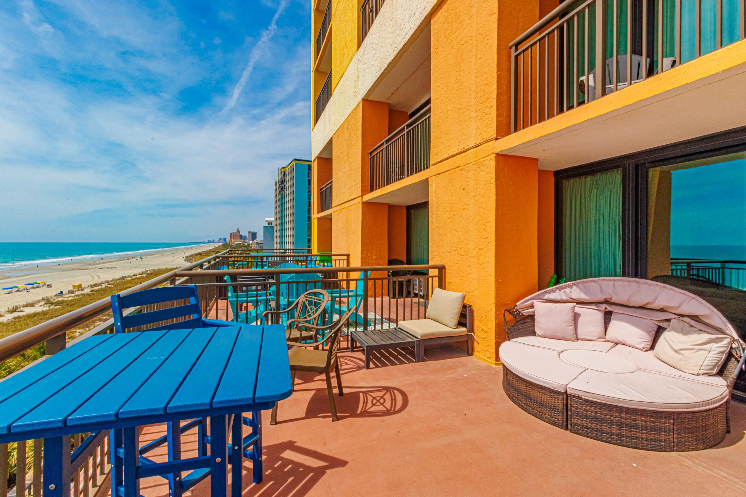 One-of-a-Kind Oceanfront Retreat at The Caravelle Discover one of Myrtle Beach’s most coveted condo styles — the exclusive 5th-floor sundeck units at The Caravelle Resort. These rarely available homes are known for their unbeatable rental performance and unforgettable oceanfront views. Step inside this fully furnished, tastefully updated condo featuring luxury vinyl plank flooring, smooth ceilings, a king-size bed, and a sleeper sofa to accommodate extra guests. The kitchen and bath showcase sleek granite countertops for a clean, modern touch. The highlight of this property is the oversized private balcony — a true outdoor living space unlike anything else on the Grand Strand. Enjoy ocean breezes from your personal daybed, host dinners at the outdoor table, or simply unwind while taking in the endless views of the Atlantic. Nestled on quiet 69th Avenue North, The Caravelle offers the perfect blend of relaxation and convenience—close to Myrtle Beach’s best dining, entertainment, and shopping yet tucked away from the bustle of downtown. Resort amenities include a fitness center, multiple pools and water attractions, an arcade, ice cream shop, and an on-site restaurant and bar. Don’t miss this chance to own a standout oceanfront condo with one of the most impressive balconies on the beach!
