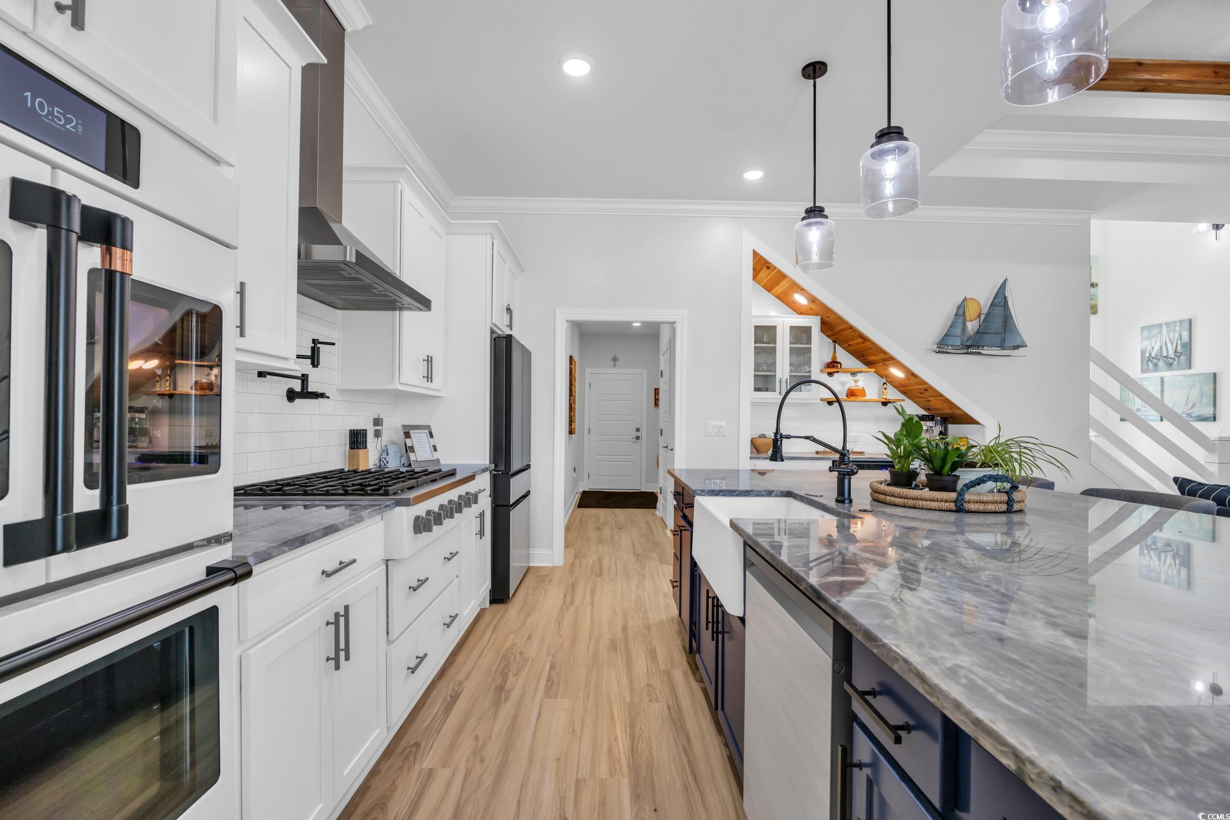 Work Island, Dishwasher, Garbage Disposal, Refrigerator, Microwave, Pantry, Double Oven, Range Hood, Solid Surface Countertops, Cook Top