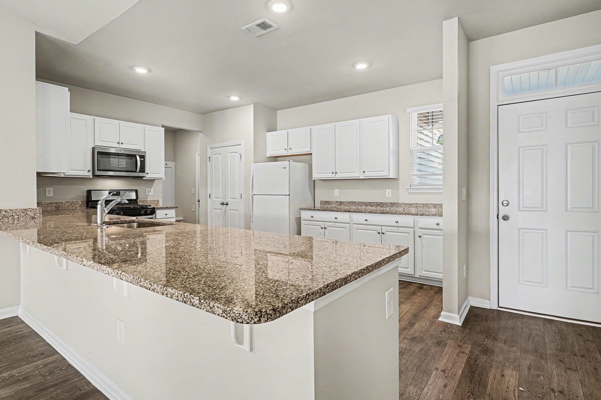 Range, Dishwasher, Garbage Disposal, Refrigerator, Microwave, Breakfast Bar, Pantry, Solid Surface Countertops