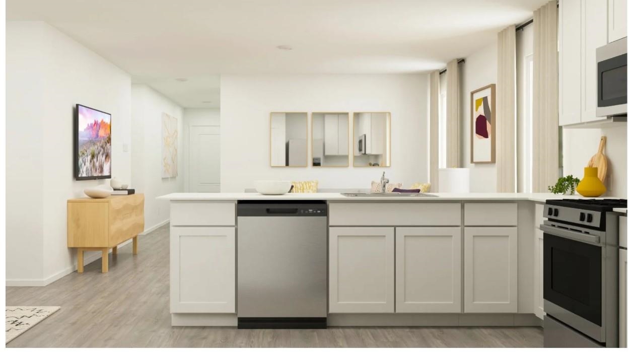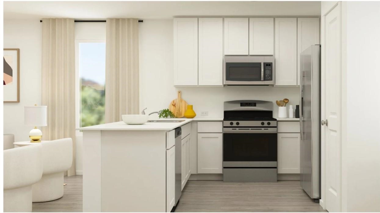 Range, Work Island, Dishwasher, Garbage Disposal, Microwave, Pantry, Stainless Steel Apps., Solid Surface Countertops