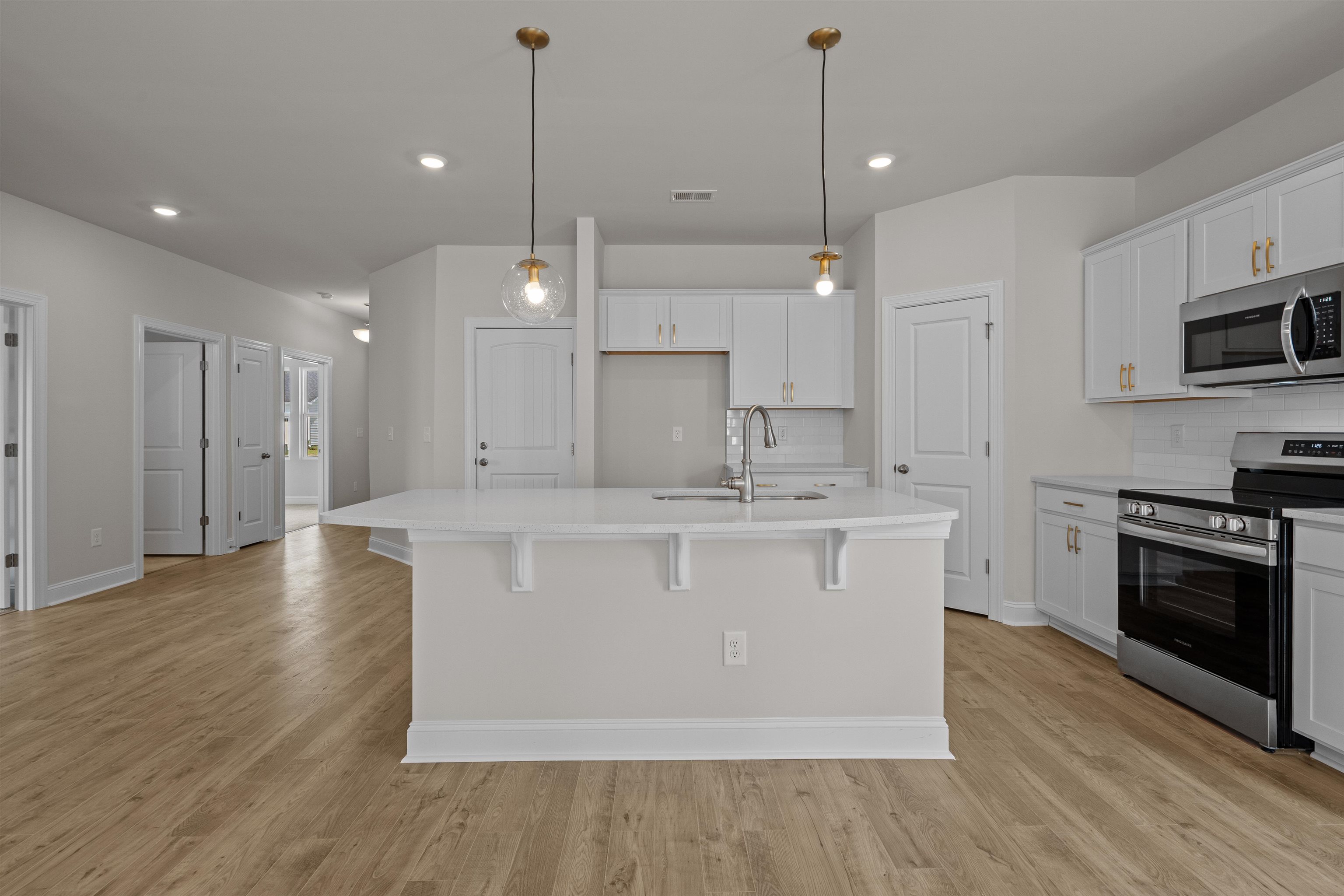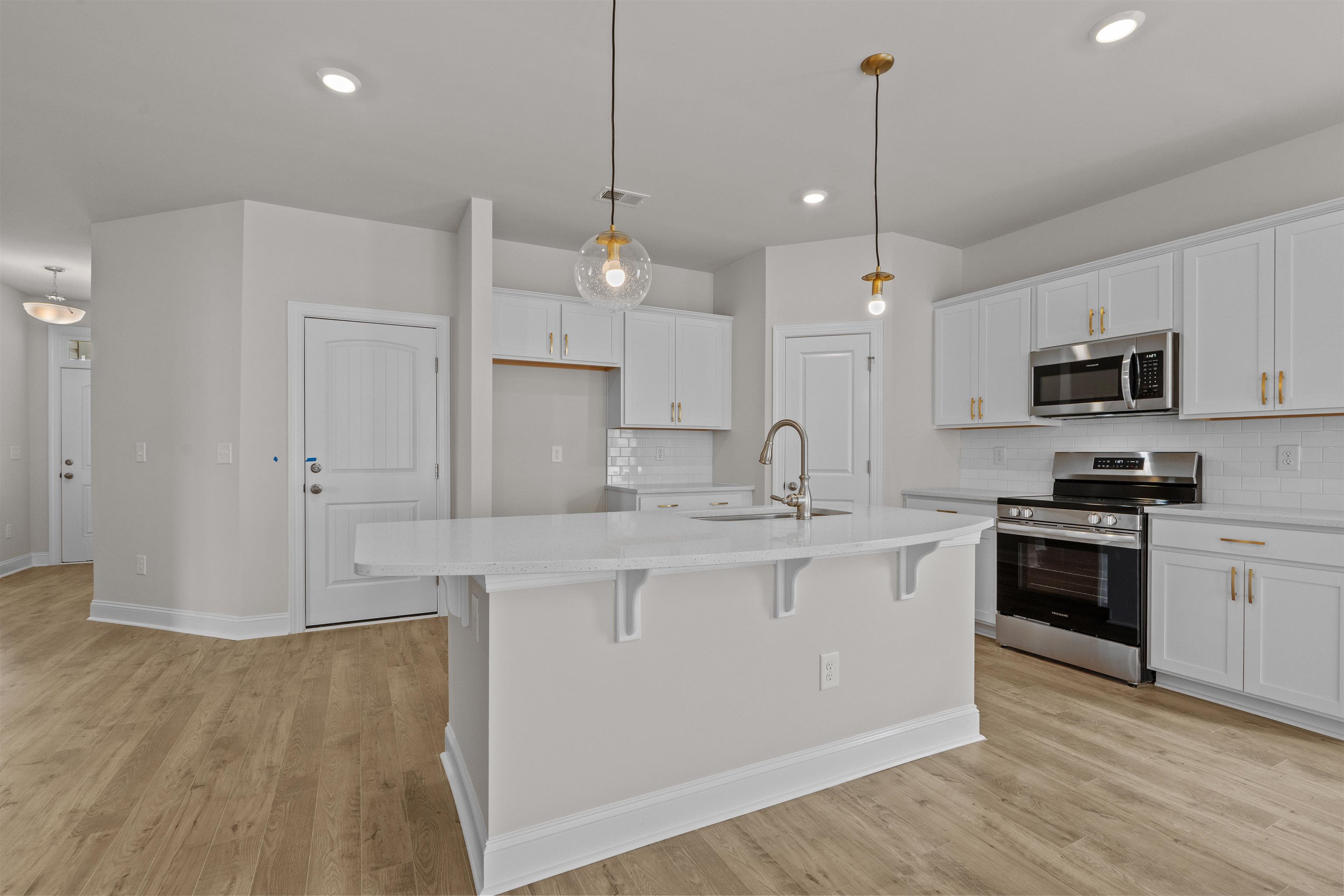 Range, Work Island, Dishwasher, Garbage Disposal, Microwave, Breakfast Bar, Pantry, Breakfast Nook, Stainless Steel Apps., Solid Surface Countertops