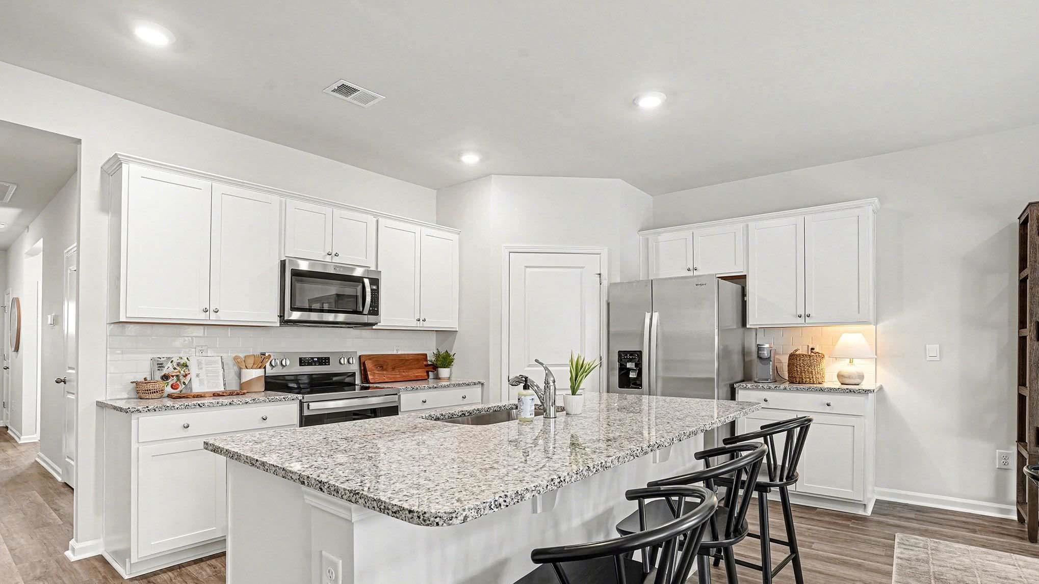 Range, Work Island, Dishwasher, Garbage Disposal, Refrigerator, Microwave, Pantry, Stainless Steel Apps., Solid Surface Countertops