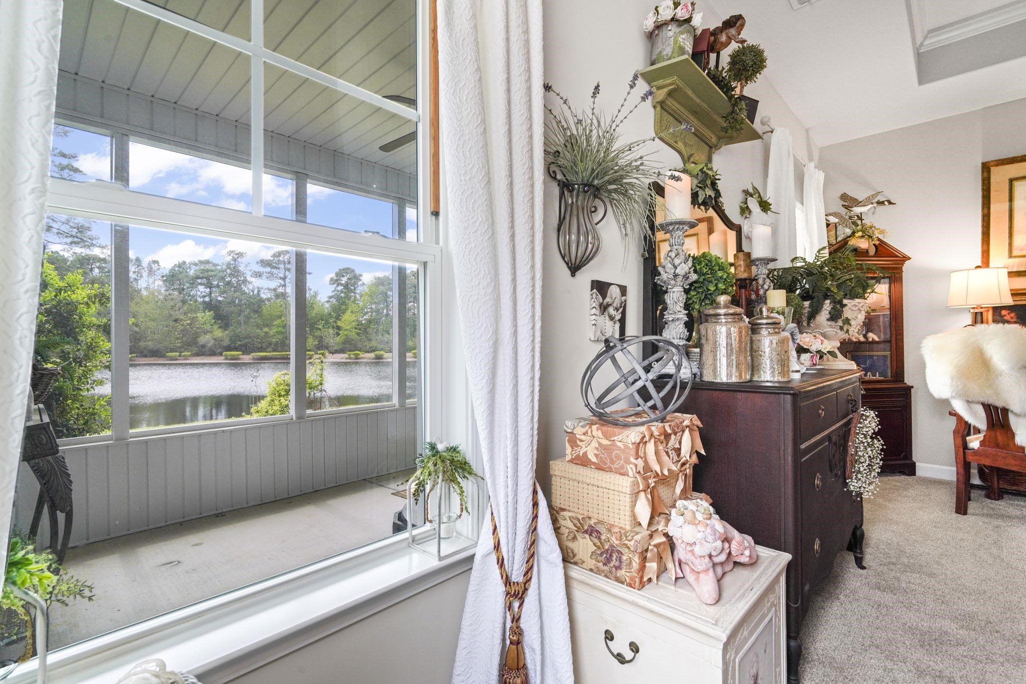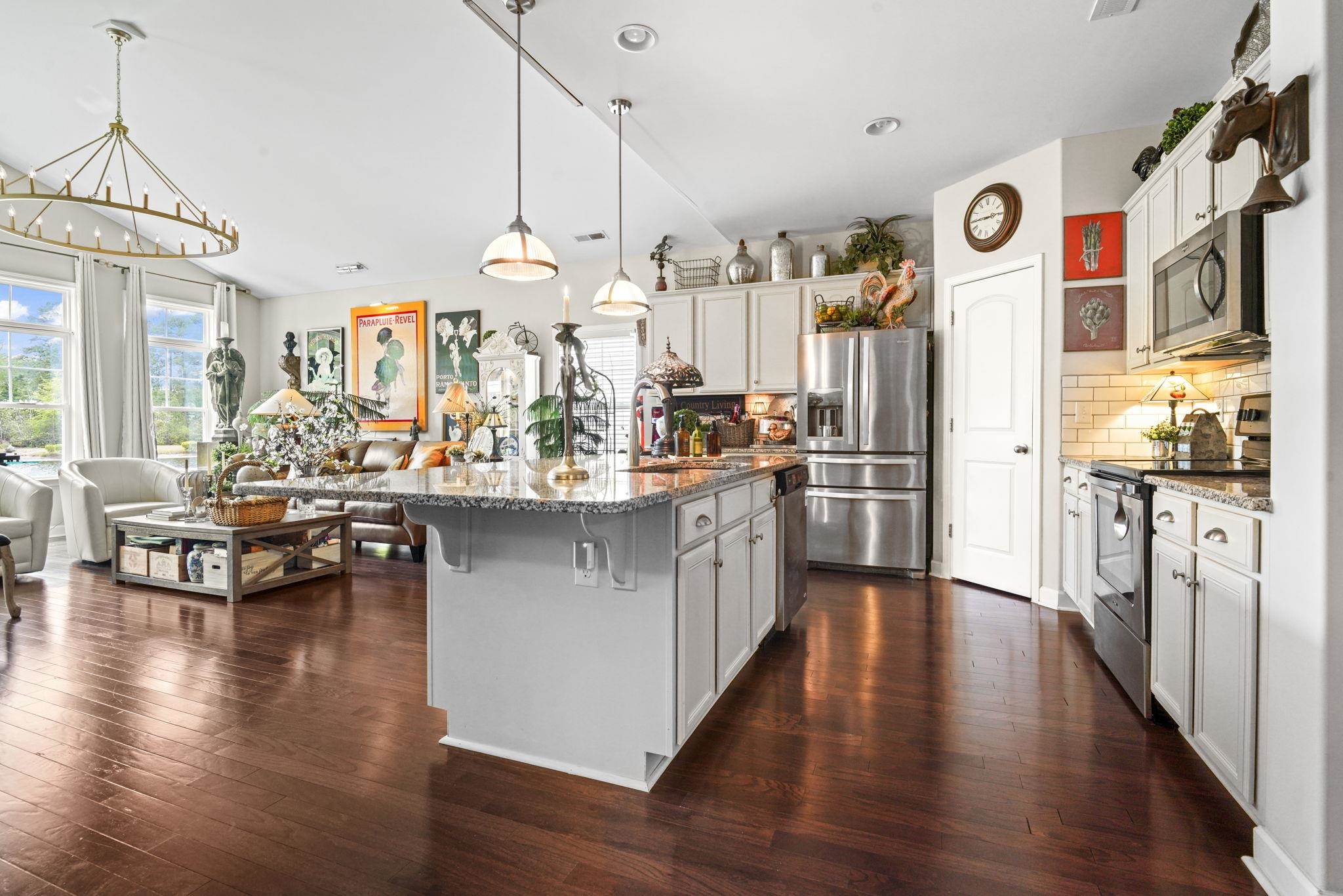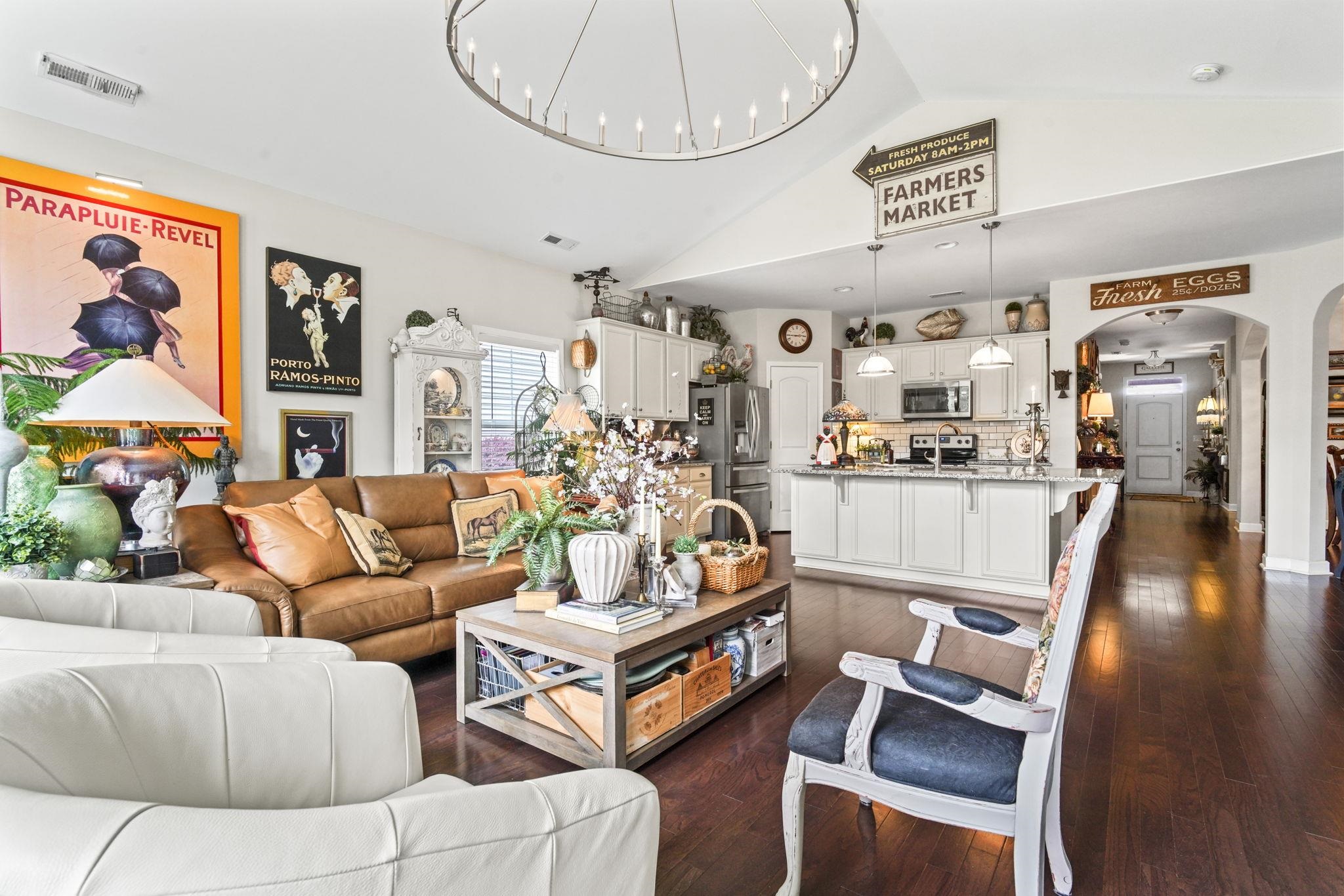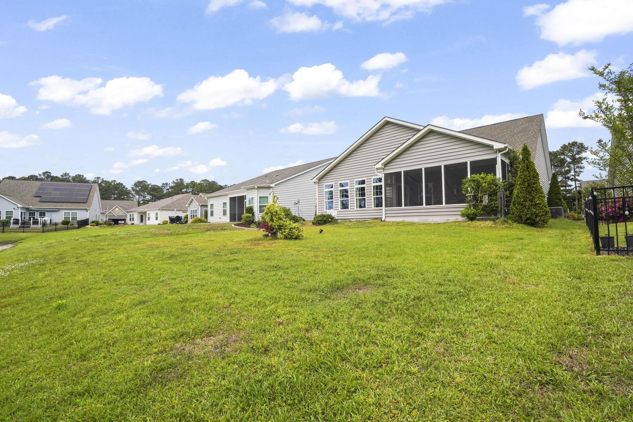 Designed by an interior designer, this stunning 3-bedroom, 2-bath single-story home is located in the exclusive Brookberry section of The Farm—an intimate enclave of just 55 homes built by RS Parker, known for its close-knit community feel. From the moment you arrive, the attention to detail is evident with lush landscaping, an irrigation system, and a beautifully tiled front entry. Inside, the foyer welcomes you with real hardwood flooring in a factory white oak French finish, setting the tone for the elevated design throughout. The home features a formal dining room with two statement chandeliers, a spacious laundry room, and a two-car garage. The main living area is filled with natural light from four tall windows showcasing serene pond and preserve views, complemented by vaulted ceilings and a striking bronze hanging light fixture. The kitchen is thoughtfully upgraded with the largest granite countertop offered by the builder, stainless steel appliances, updated fixtures and lighting, and an air purification system. The primary suite offers peaceful water views with additional windows creating a panoramic feel, along with a tiled step-in shower featuring safety handrails. Enjoy quiet mornings or relaxing evenings on the screened porch with a knee wall, overlooking a private backyard and natural surroundings. This one-of-a-kind home also offers access to community amenities including two pools, a playground, fitness room, and basketball court. Conveniently located just minutes from Tanger Outlets, dining, medical facilities, and everyday essentials—and only a short drive to the beach.