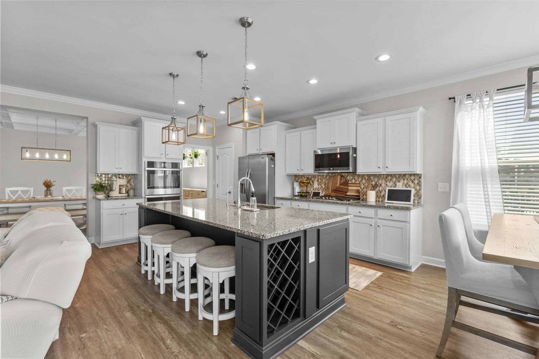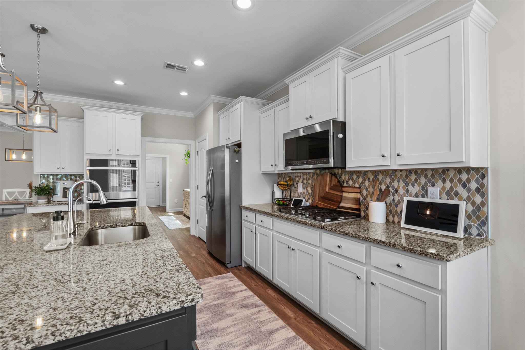 Range, Work Island, Dishwasher, Garbage Disposal, Refrigerator, Microwave, Breakfast Bar, Pantry, Breakfast Nook, Stainless Steel Apps., Solid Surface Countertops