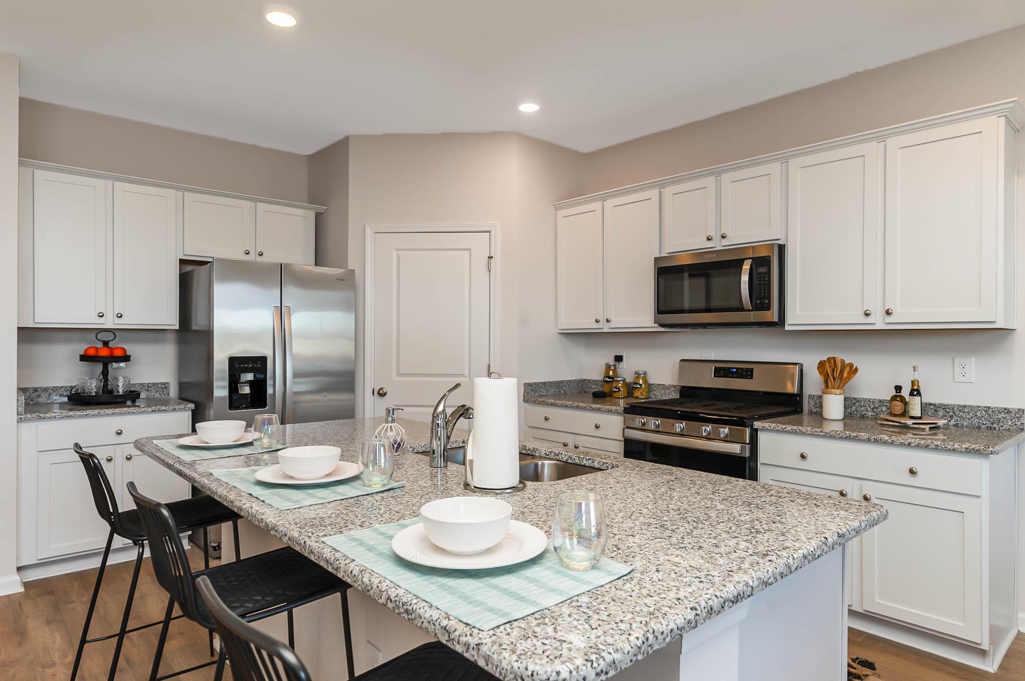 Range, Work Island, Dishwasher, Garbage Disposal, Refrigerator, Microwave, Breakfast Bar, Pantry, Stainless Steel Apps., Solid Surface Countertops