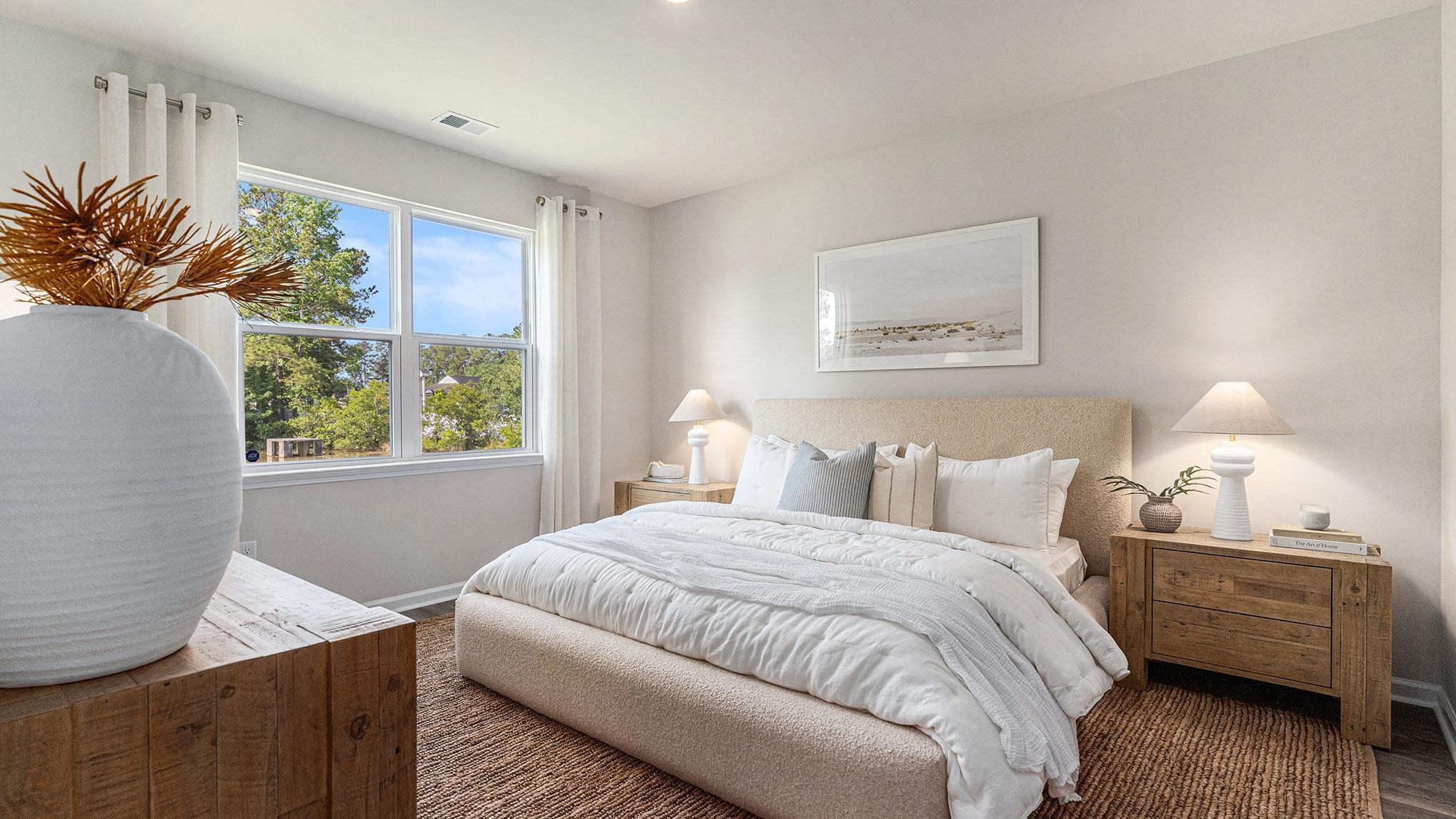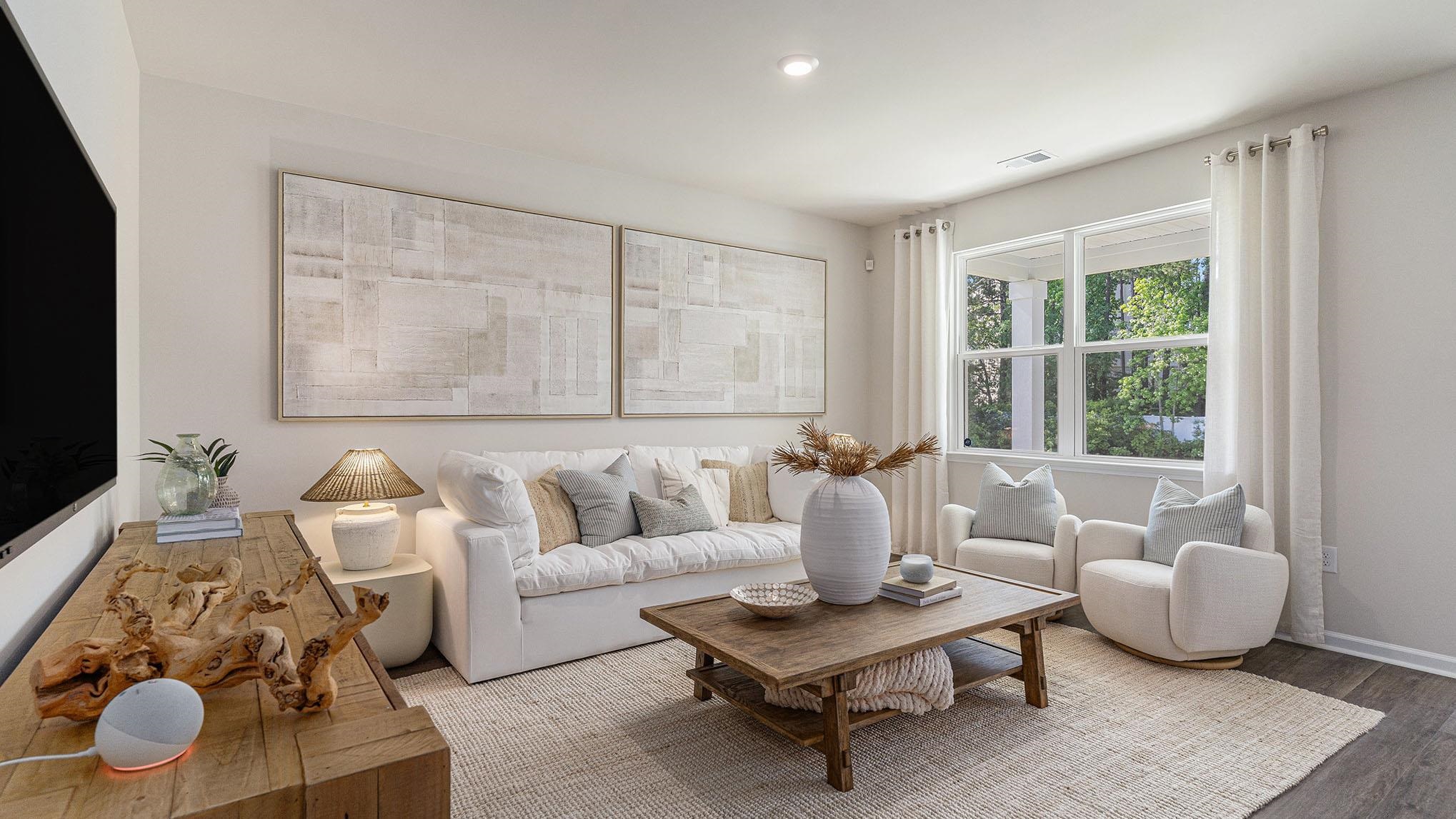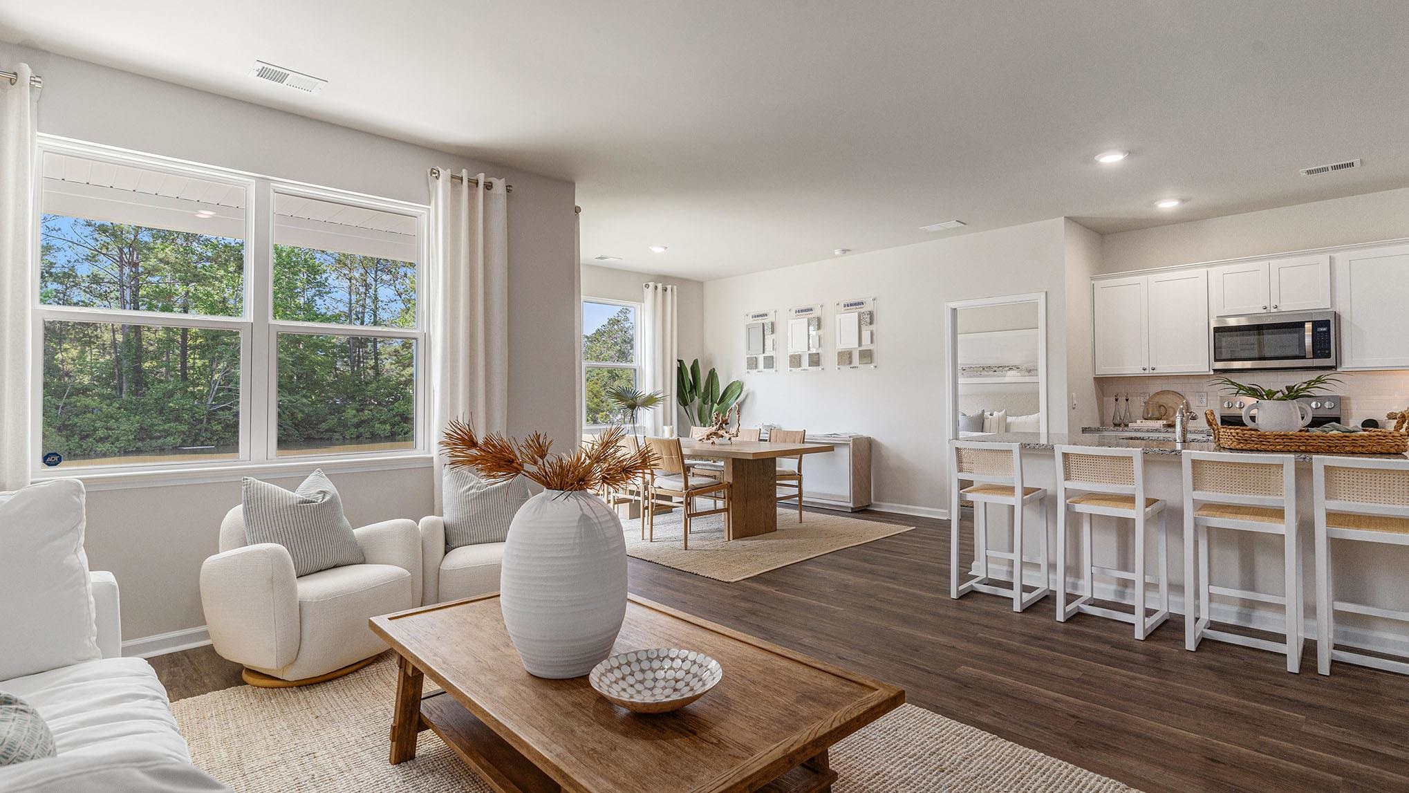 This thoughtfully designed one level home is one of our most popular floor plans! With an open concept living room, dining room and kitchen, this home is bright, spacious, and designed for entertaining guest or comfortably interacting with family. The kitchen features granite countertops, a tile backsplash, 36" cabinets, a spacious pantry, stainless steel appliances including a refrigerator, and island with breakfast bar! Your primary suite awaits off the back of the home with a spacious walk-in closet and master bath with double sinks, a linen closet and 5' shower. Two secondary bedrooms are at the front of the home providing separation from the primary suite. Enjoy the coastal air from the back porch as you wind down in the evening! 2 car garage with garage door opener. This is America's Smart Home! Each of our homes comes with an industry leading smart home technology package that will allow you to control the thermostat, front door light and lock, and video doorbell from your smartphone. *Photos are of a similar Aria home. Pictures, photographs, colors, features, and sizes are for illustration purposes only and will vary from the homes as built. Home and community information, including pricing, included features, terms, availability and amenities, are subject to change and prior sale at any time without notice or obligation. Square footage dimensions are approximate. Equal housing opportunity builder.