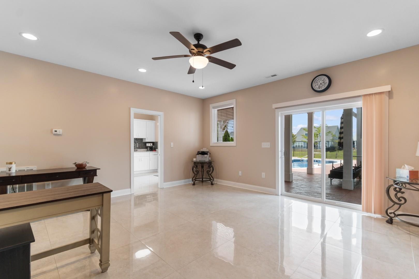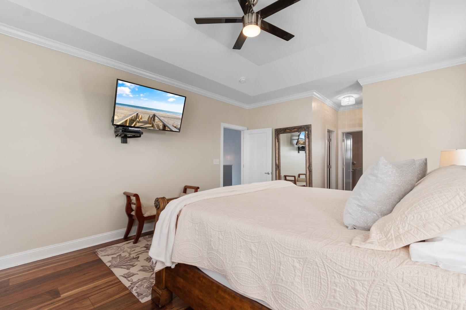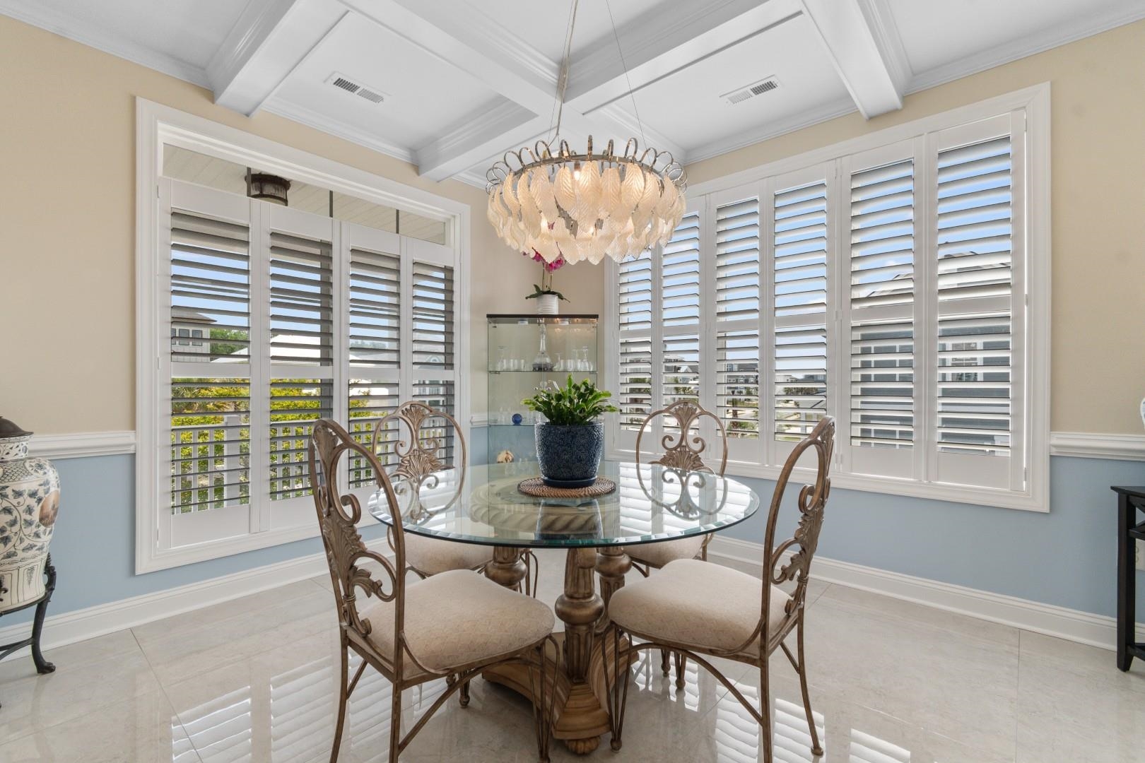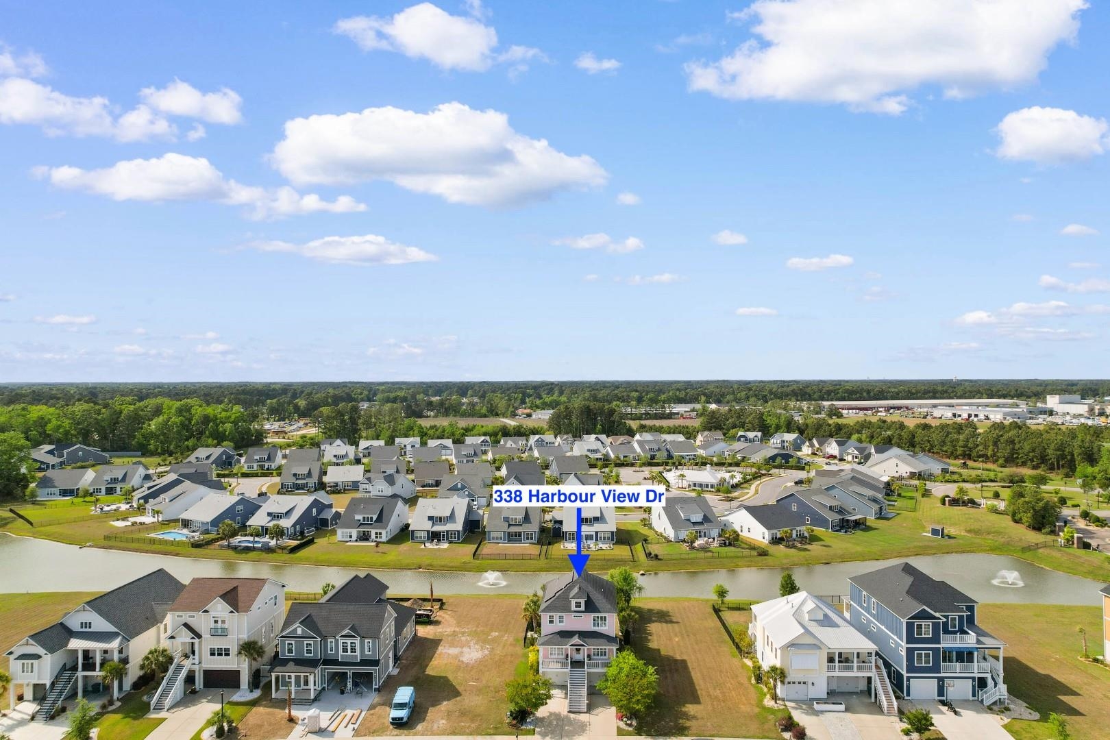 Embrace a lifestyle of contemporary coastal elegance at 338 Harbour View Drive, a breathtaking three-story sanctuary situated in the prestigious Boardwalk on the Waterway enclave. Defined by crisp minimalism and polished sophistication, the interior shines with 30x30 reflective floor tiles and a gourmet kitchen outfitted with high-gloss cabinetry from Holland and swirled marble-granite surfaces. From the formal dining room's ornate coffered ceilings to the dazzling Ethan Allen centerpiece over the staircase, every corner of this 3,134-square-foot residence has been curated to maximize natural light and views of the surrounding boating paradise. The property's layout is uniquely functional, highlighted by a ground-level living space that offers immense lifestyle value. This self-contained suite features a stylish kitchenette, private laundry, and a full bath, serving perfectly as an in-law/guest retreat, luxurious poolside cabana, or family game-room & flex space. Large sliding doors provide seamless transitions from this suite to a backyard oasis, where a heated saltwater pool sits framed by privacy hedges and swaying palms. Whether you are relaxing on the oversized second-story veranda or enjoying the evening glow of the pool's dusk-to-dawn lighting, the outdoor living spaces are designed for effortless entertaining. Opulence continues on the top floor within the primary suite, a sprawling refuge featuring a tray ceiling and a spectacular "walk-through" wet room shower. Beyond the visual appeal, this home is a model of modern efficiency, boasting a fully owned 17-panel solar system that slashes energy expenses, alongside a tankless water heater and a three-car capacity garage with epoxy flooring. With exclusive access to a community boat launch and a scenic boardwalk, this home represents a rare opportunity to own a high-tech, custom-built gem just minutes from the sands of Myrtle Beach.