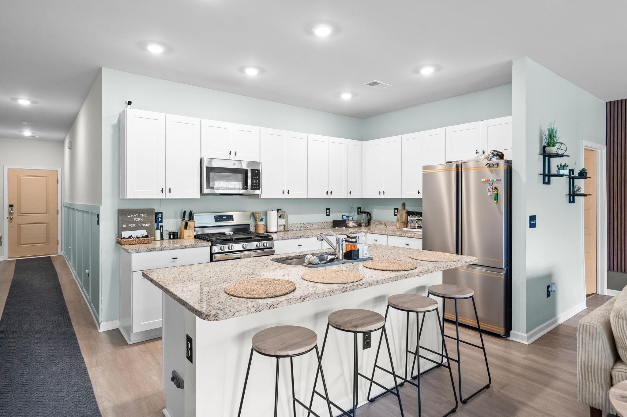 Range, Work Island, Dishwasher, Garbage Disposal, Refrigerator, Microwave, Breakfast Bar, Pantry, Stainless Steel Apps., Solid Surface Countertops
