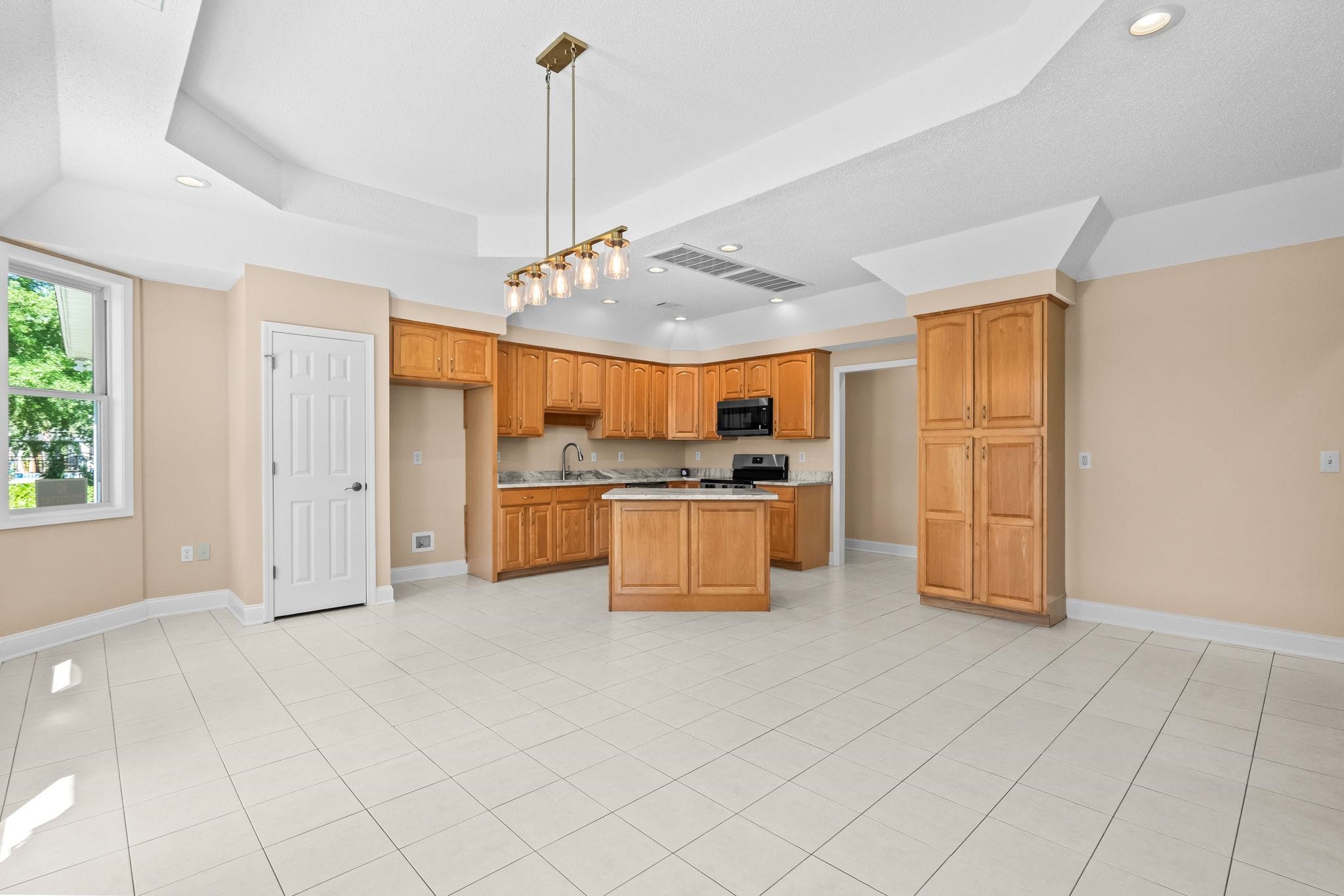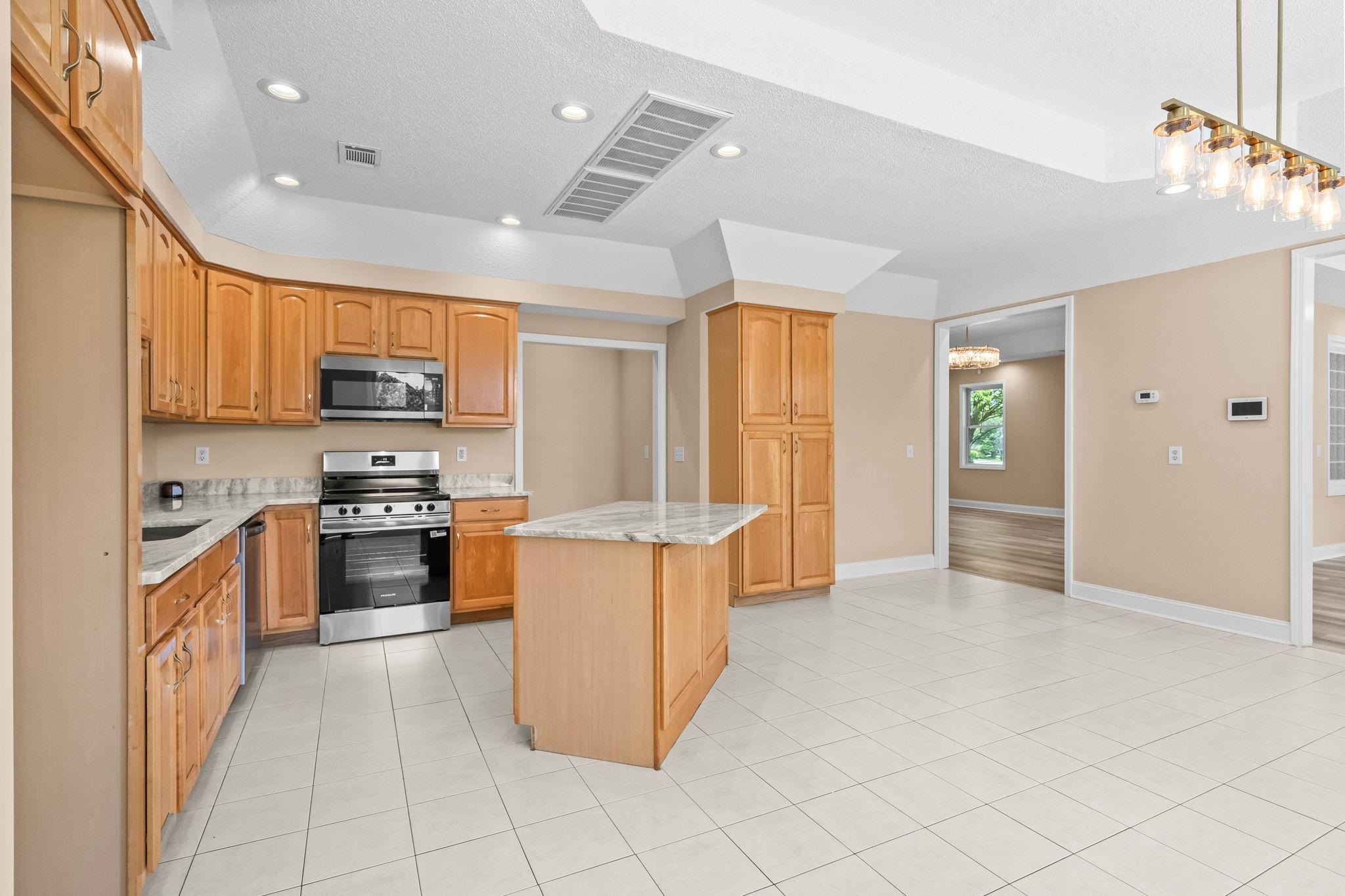 Range, Work Island, Dishwasher, Garbage Disposal, Microwave, Pantry, Stainless Steel Apps., Solid Surface Countertops