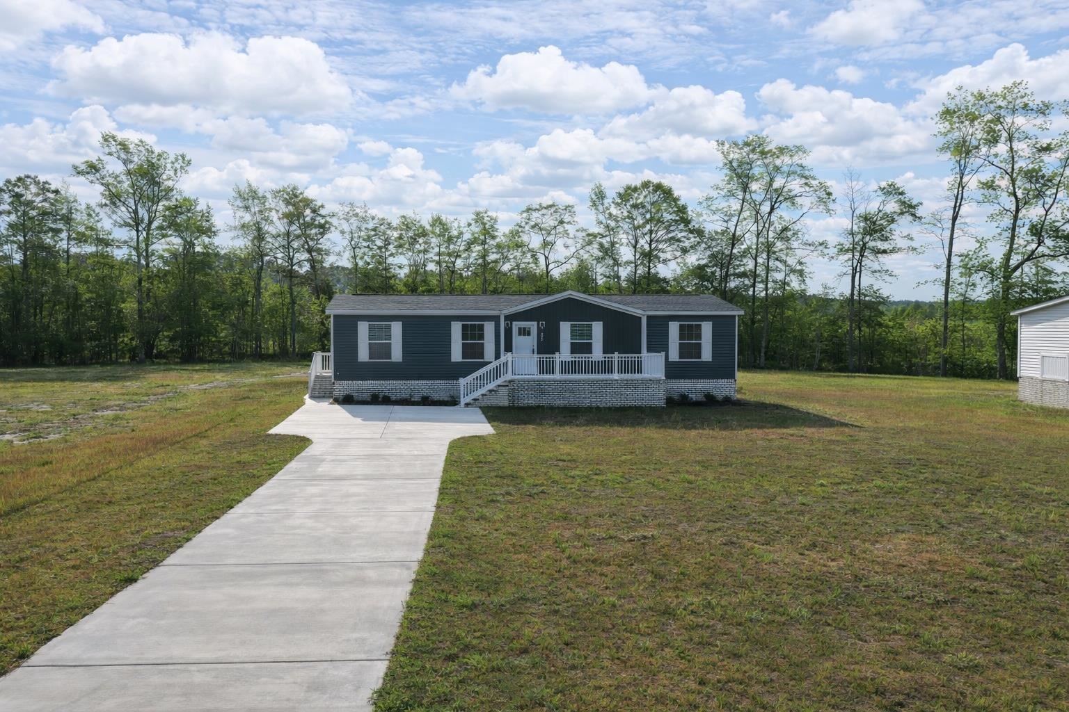 Welcome to this beautiful, brand-new manufactured home featuring brick underpinning and situated on approximately 0.79 of an acre of peaceful land with no HOA restrictions. This thoughtfully designed home offers three spacious bedrooms and two full bathrooms, providing comfort and functionality for everyday living. The open floor plan creates a seamless flow throughout the main living areas, and the inviting living room includes a cozy fireplace that makes the space feel warm and welcoming. The large kitchen island is perfect for entertaining guests or enjoying casual meals, while also offering plenty of prep space for cooking. A built-in desk area provides a convenient spot for working from home, helping with homework, or tackling creative projects. The laundry room is both practical and spacious, featuring a utility sink and abundant storage. This property has public water and public sewer. You can enjoy the peace and privacy of rural living while still being just approximately 21 minutes from North Myrtle Beach, where you’ll find beautiful beaches, restaurants, entertainment, and golf. Buyer is responsible for all measurement verifications.