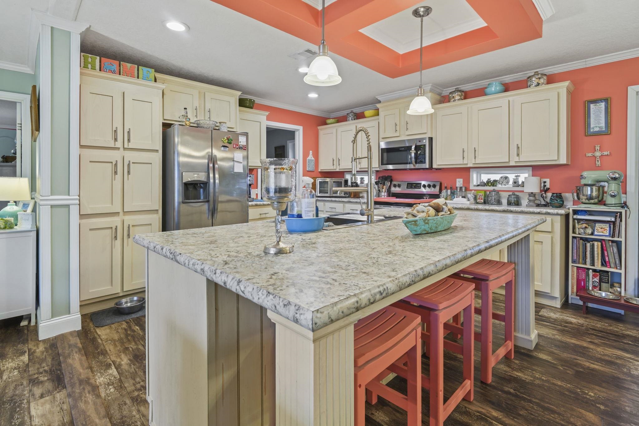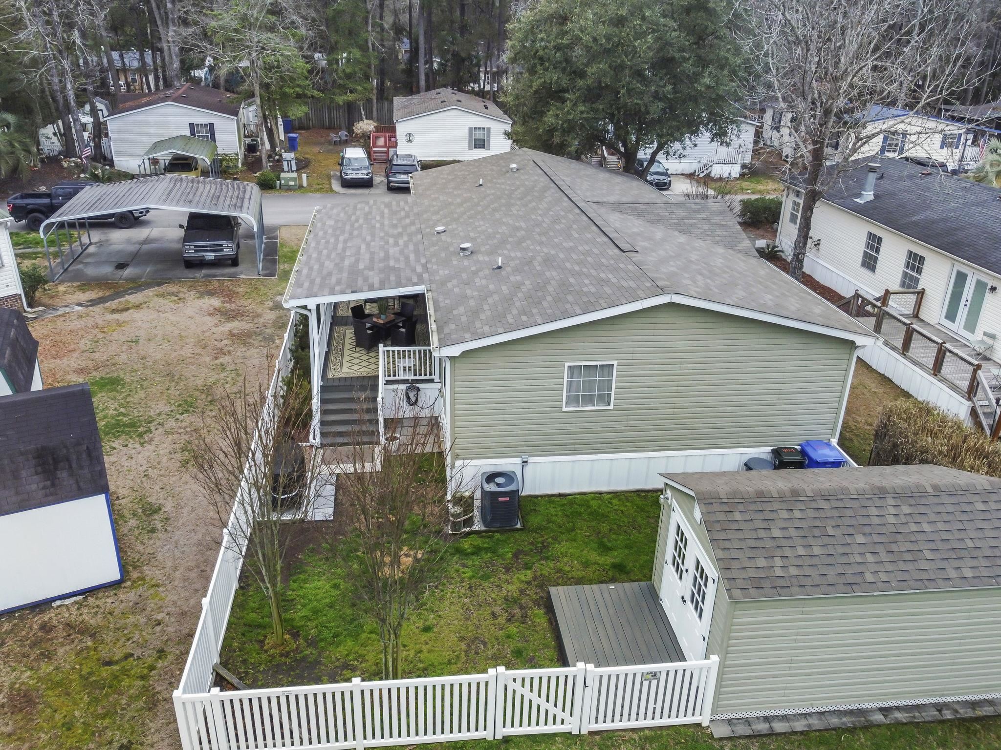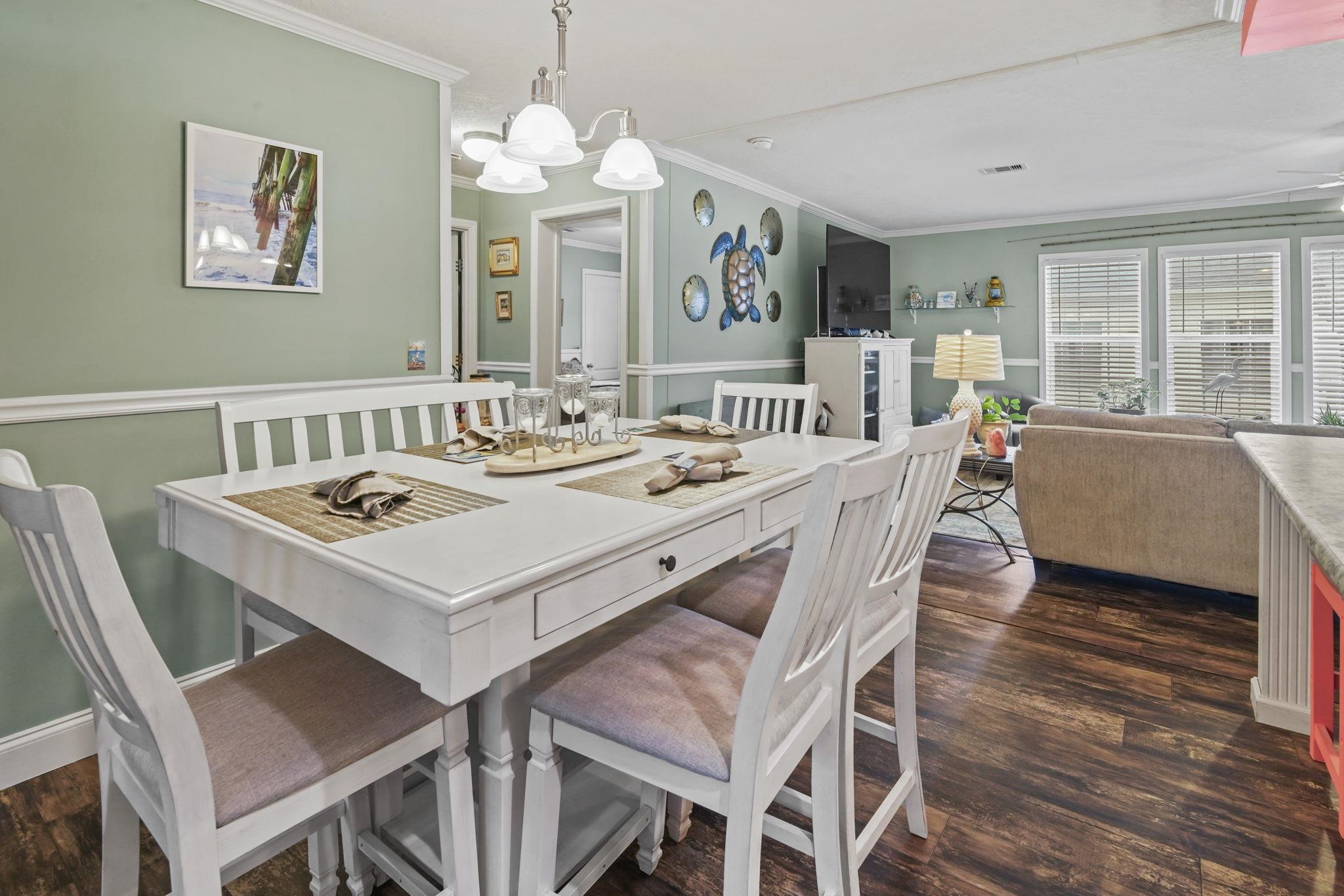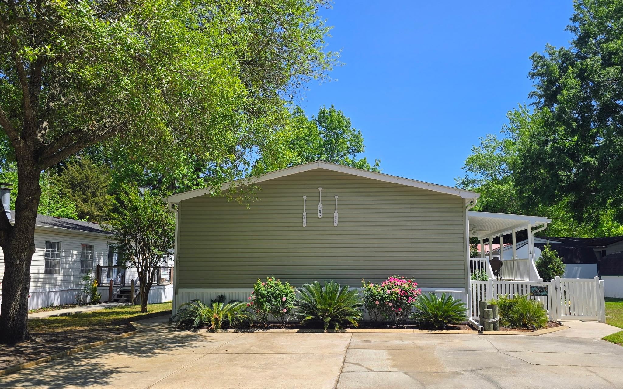 Coastal Living at its Finest! Experience the ultimate beachside lifestyle in this stunning, move-in-ready home located in a convenient golf cart community just one mile from the shore. This beautifully appointed residence features a seamless coastal theme throughout, highlighted by durable LVP flooring and updated lighting and ceiling fans. At the heart of the home, the open floorplan kitchen boasts a large island and stainless steel appliances, perfect for entertaining. The thoughtful split floor plan offers maximum privacy, featuring three spacious bedrooms—all with their own walk-in closets. The master suite serves as a private retreat, offering a spa-like bath with dual vanities, a garden tub, and a separate tile shower. The living space extends outdoors to a large covered deck overlooking a meticulously landscaped, fenced-in yard that comes alive at night with automatic dusk-to-dawn lighting. Functional upgrades abound, including a dedicated mud/laundry room, a security system, outside storage building, and the home is wired for a generator for total peace of mind. Whether you are cruising to the beach in your golf cart or relaxing in the coastal breeze on your back deck, this home offers the perfect blend of luxury and location.