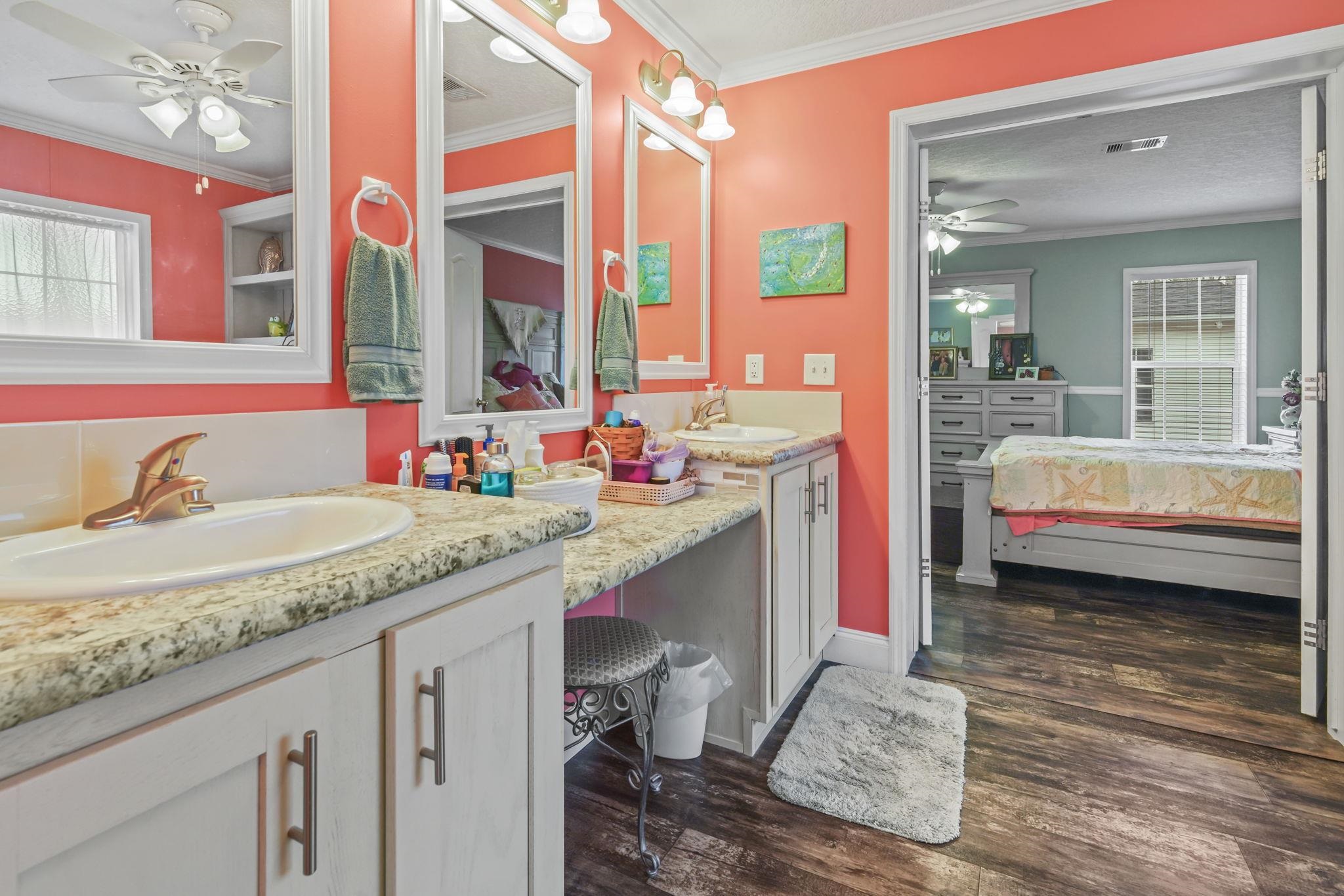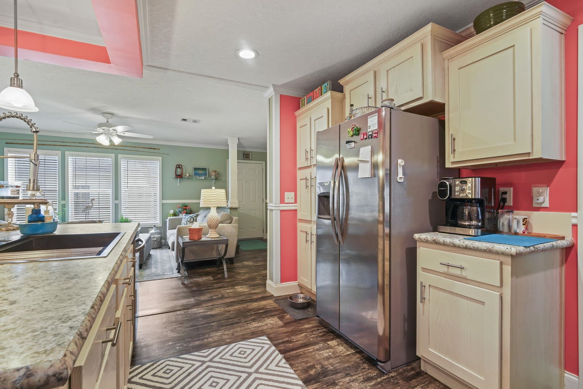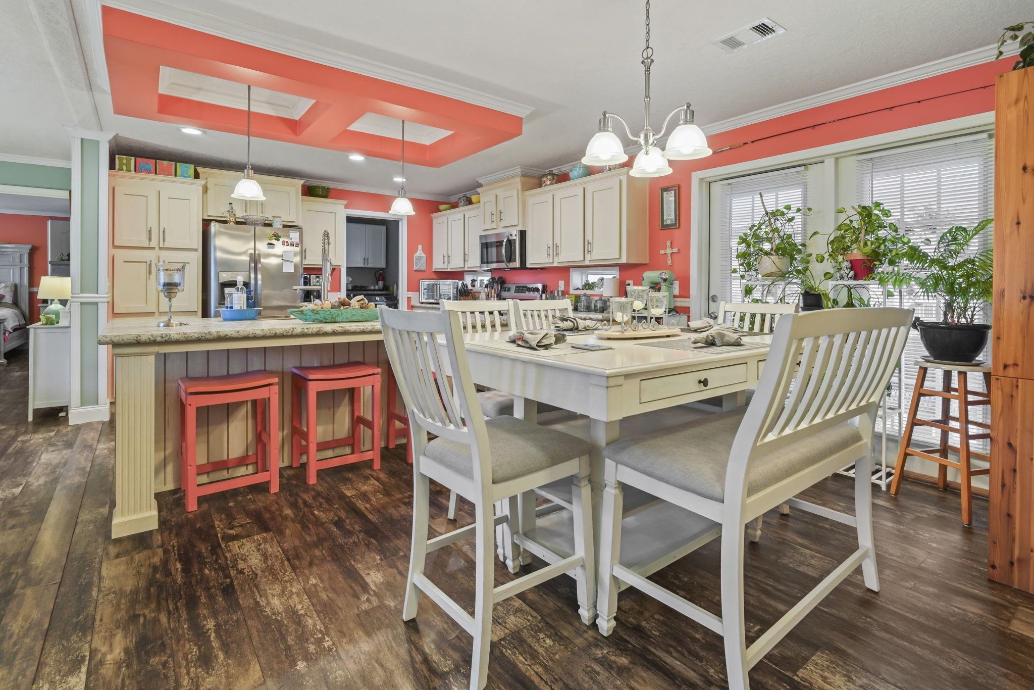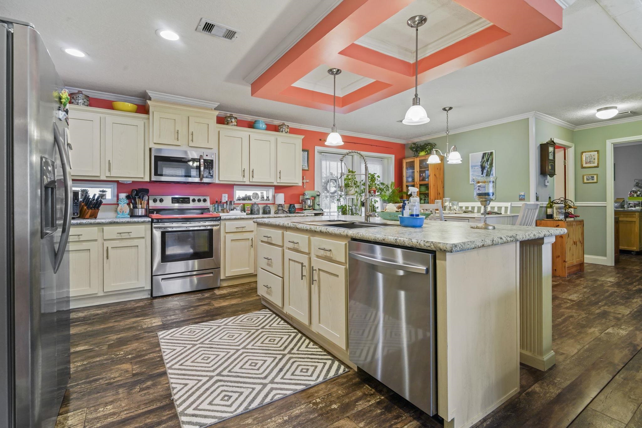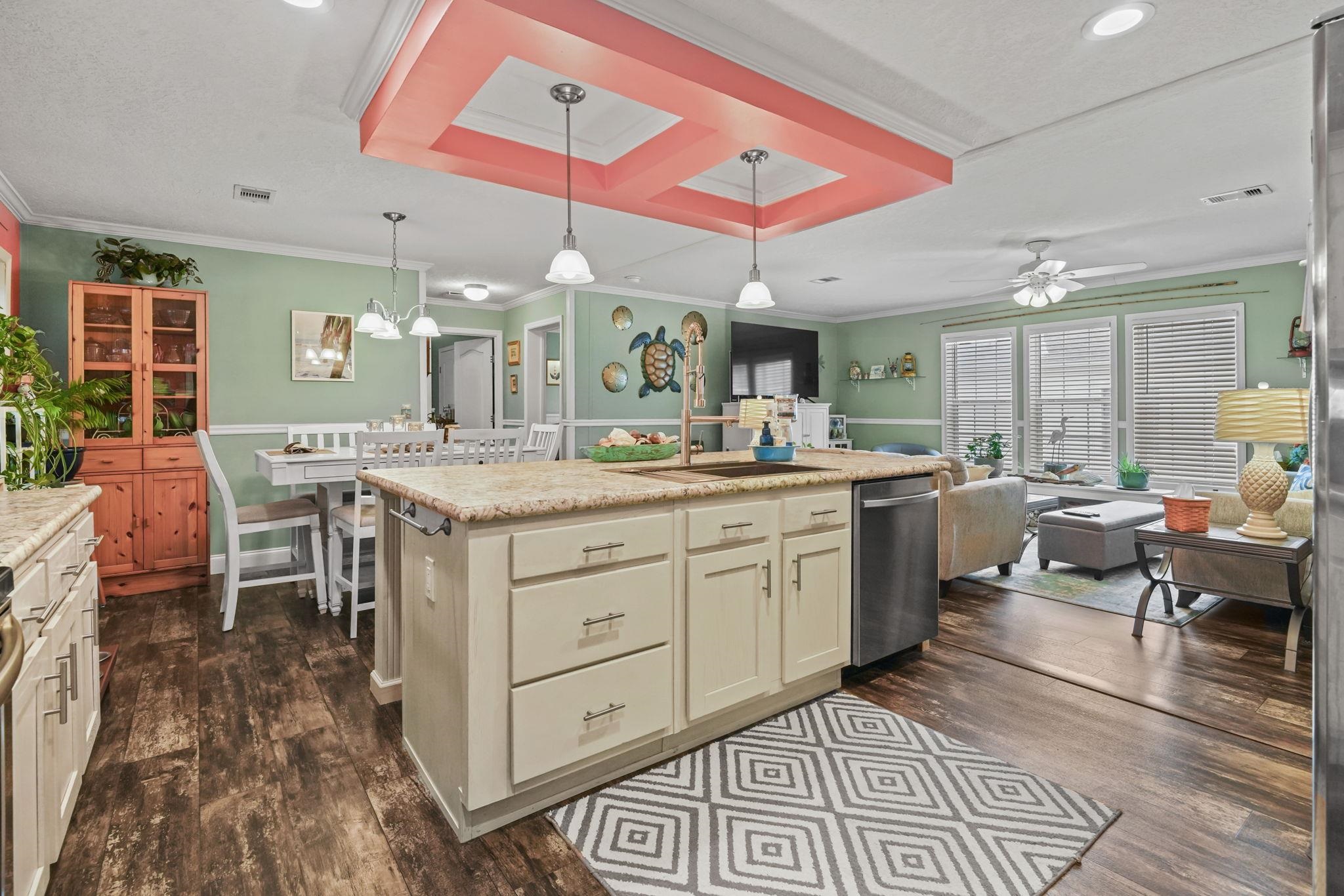 Coastal Living at its Finest! Experience the ultimate beachside lifestyle in this stunning, move-in-ready home located in a convenient golf cart community just one mile from the shore. This beautifully appointed residence features a seamless coastal theme throughout, highlighted by durable LVP flooring and updated lighting and ceiling fans. At the heart of the home, the open floorplan kitchen boasts a large island and stainless steel appliances, perfect for entertaining. The thoughtful split floor plan offers maximum privacy, featuring three spacious bedrooms—all with their own walk-in closets. The master suite serves as a private retreat, offering a spa-like bath with dual vanities, a garden tub, and a separate tile shower. The living space extends outdoors to a large covered deck overlooking a meticulously landscaped, fenced-in yard that comes alive at night with automatic dusk-to-dawn lighting. Functional upgrades abound, including a dedicated mud/laundry room, a security system, outside storage building, and the home is wired for a generator for total peace of mind. Whether you are cruising to the beach in your golf cart or relaxing in the coastal breeze on your back deck, this home offers the perfect blend of luxury and location.