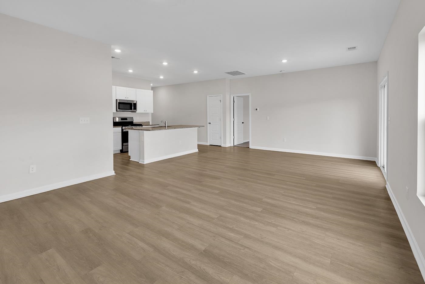 Range, Work Island, Dishwasher, Garbage Disposal, Microwave, Pantry, Stainless Steel Apps., Solid Surface Countertops, Cook Top