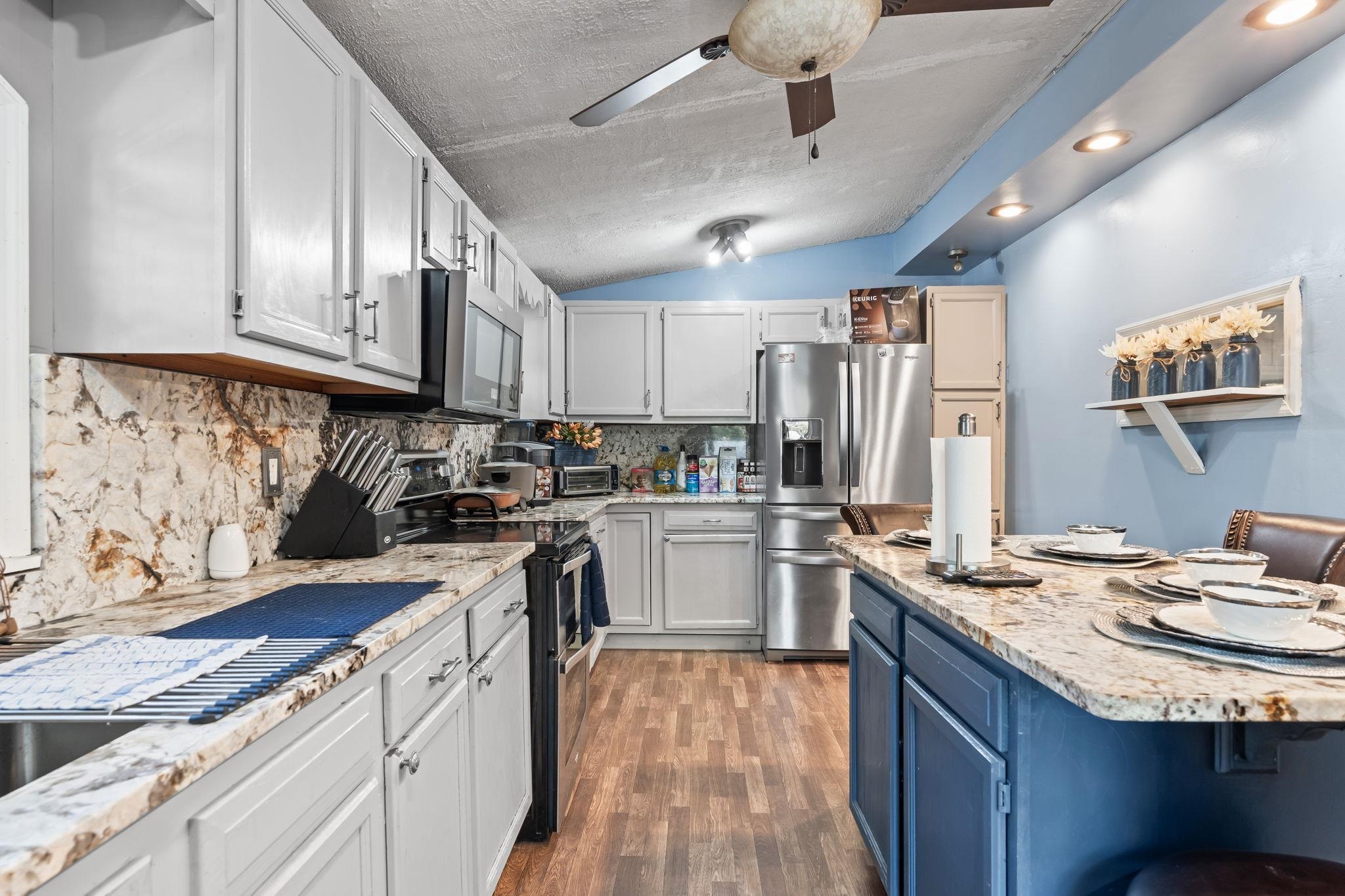 Range, Breakfast Bar, Pantry, Ceiling Fan, Stainless Steel Apps., Solid Surface Countertops