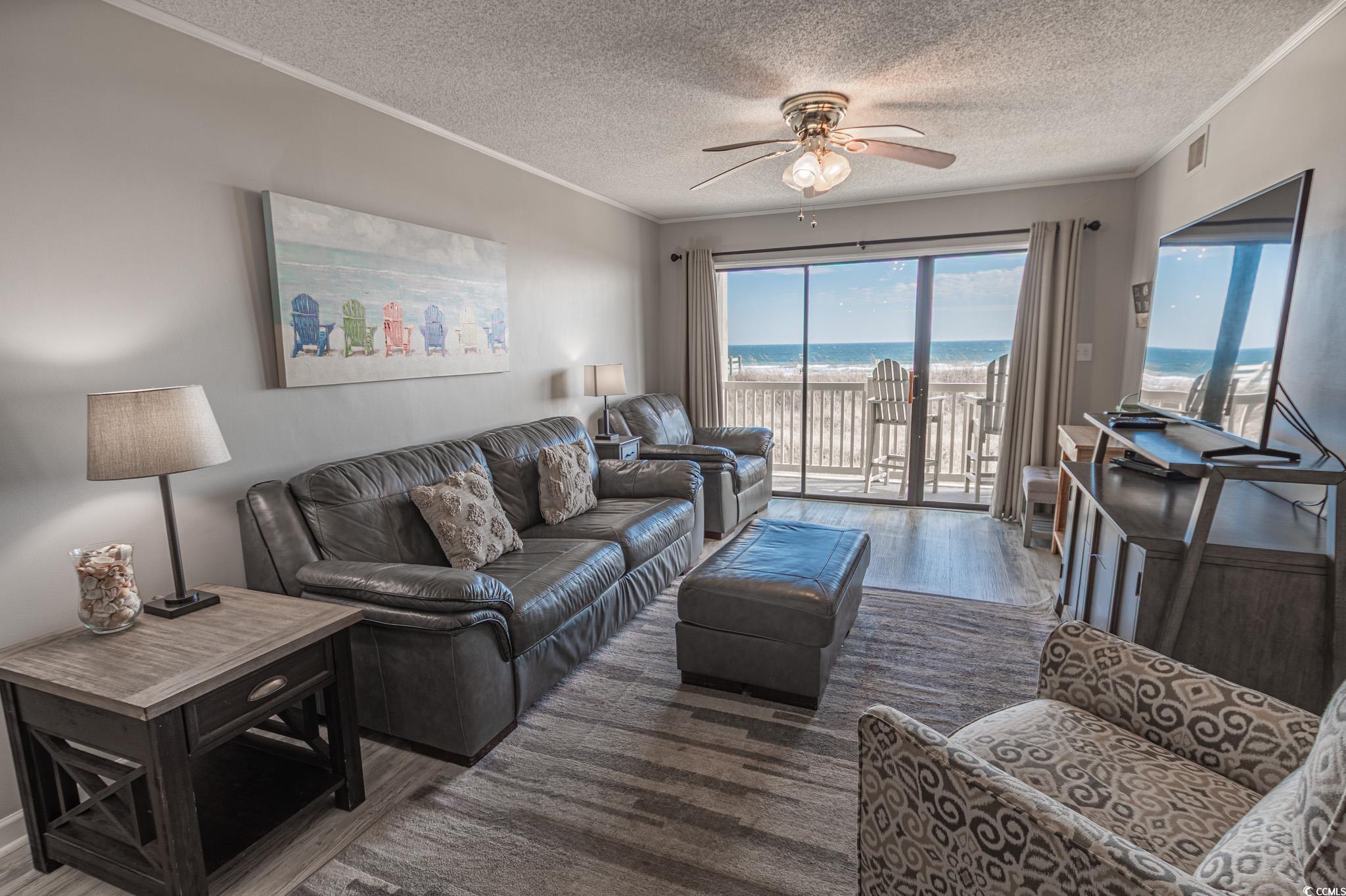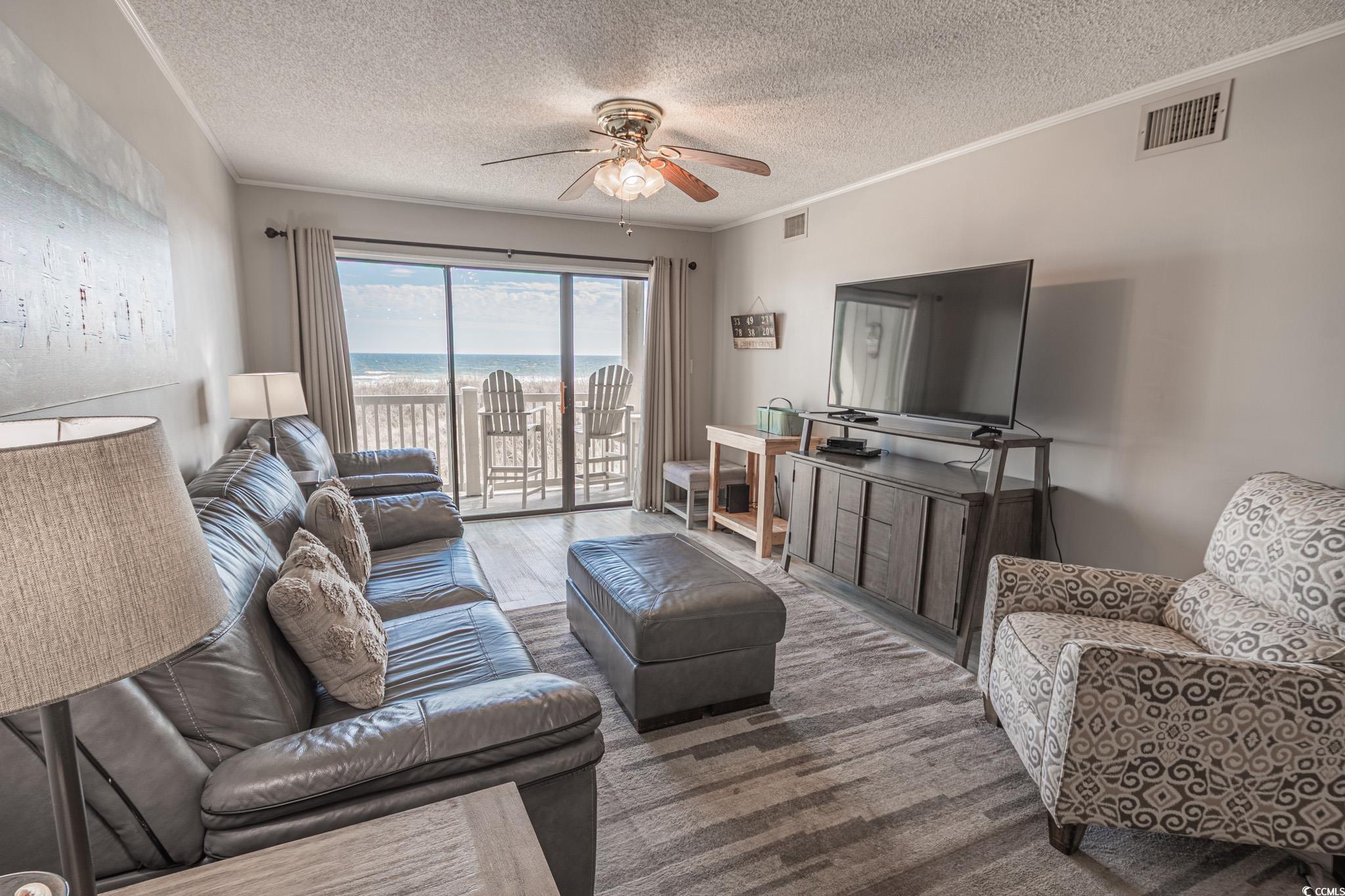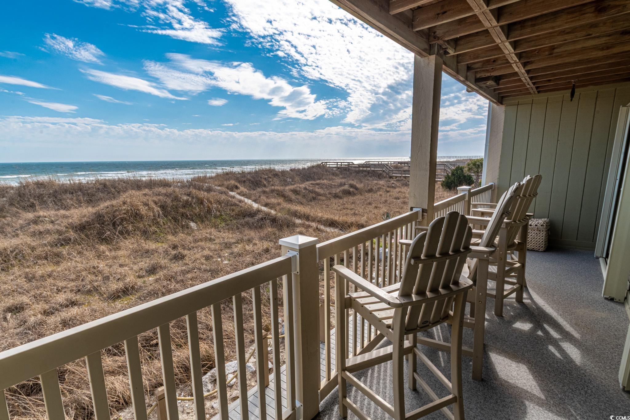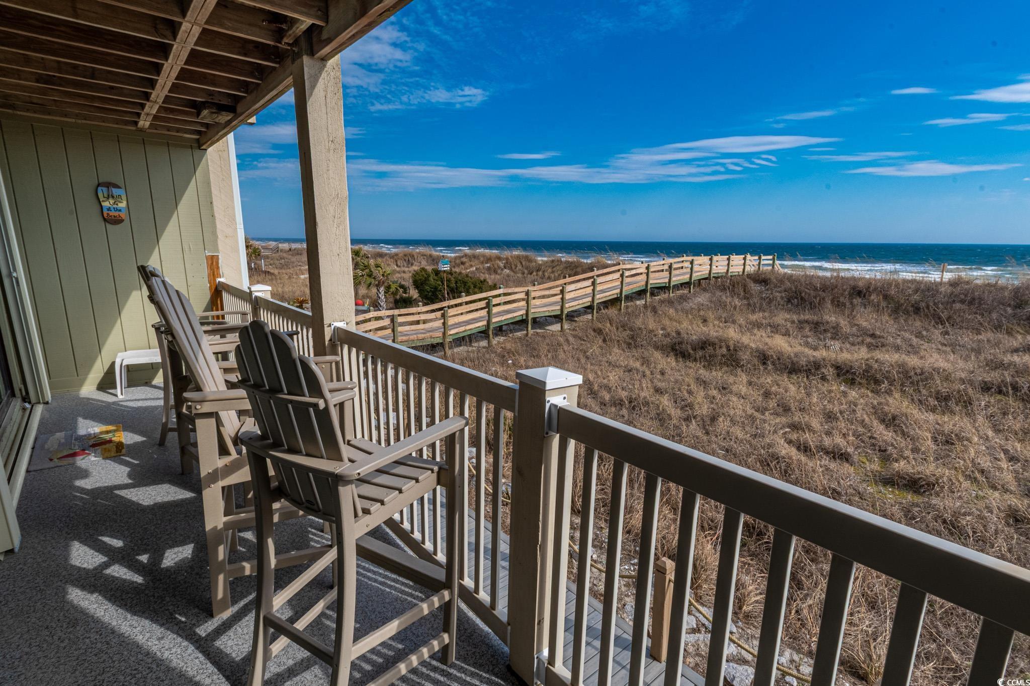 Oceanfront two bedroom, one and a half bath unit at Kings View Villas in Cherry Grove! This beautifully updated condo features LVP flooring throughout, a modern kitchen with stainless steel appliances, granite countertops, a stylish backsplash, and a convenient eat-at bar. Enjoy breathtaking beach views from the living room, which includes a ceiling fan for added comfort. Both bedrooms have ceiling fans and share a full-size hallway bath, while the oceanfront primary bedroom boasts a private half bath and stunning coastal views. Step onto the spacious covered balcony from either the living room or primary bedroom and soak in the sights and sounds of the Atlantic Ocean. Additional highlights include a stackable washer and dryer, a linen closet, and attached storage. This fully furnished unit is move-in ready! Kings View Villas offers private beach access, a pool, two grilling areas, an outdoor shower, and is conveniently located near dining, shopping, and entertainment. Square footage is approximate; buyers should verify.