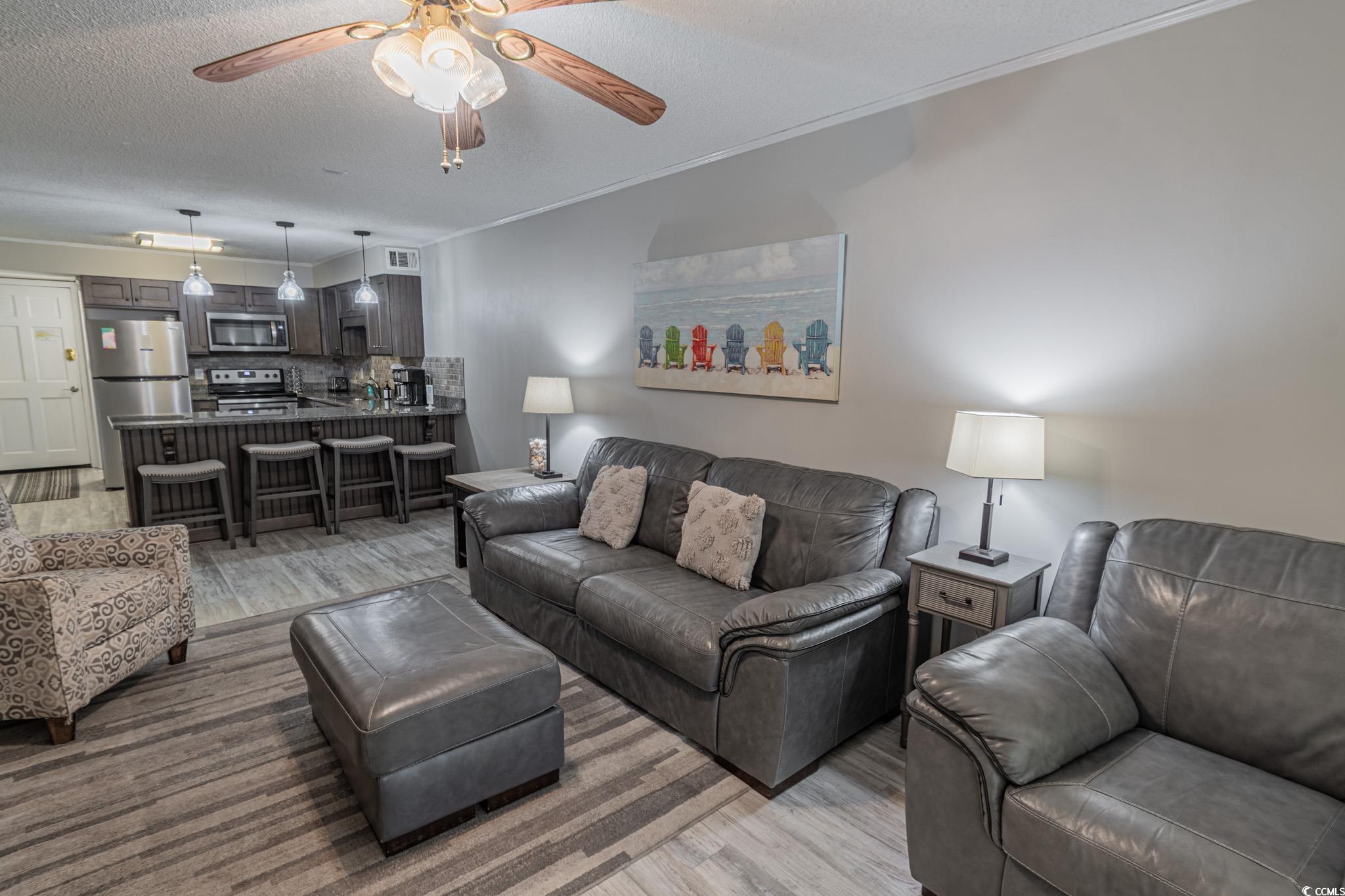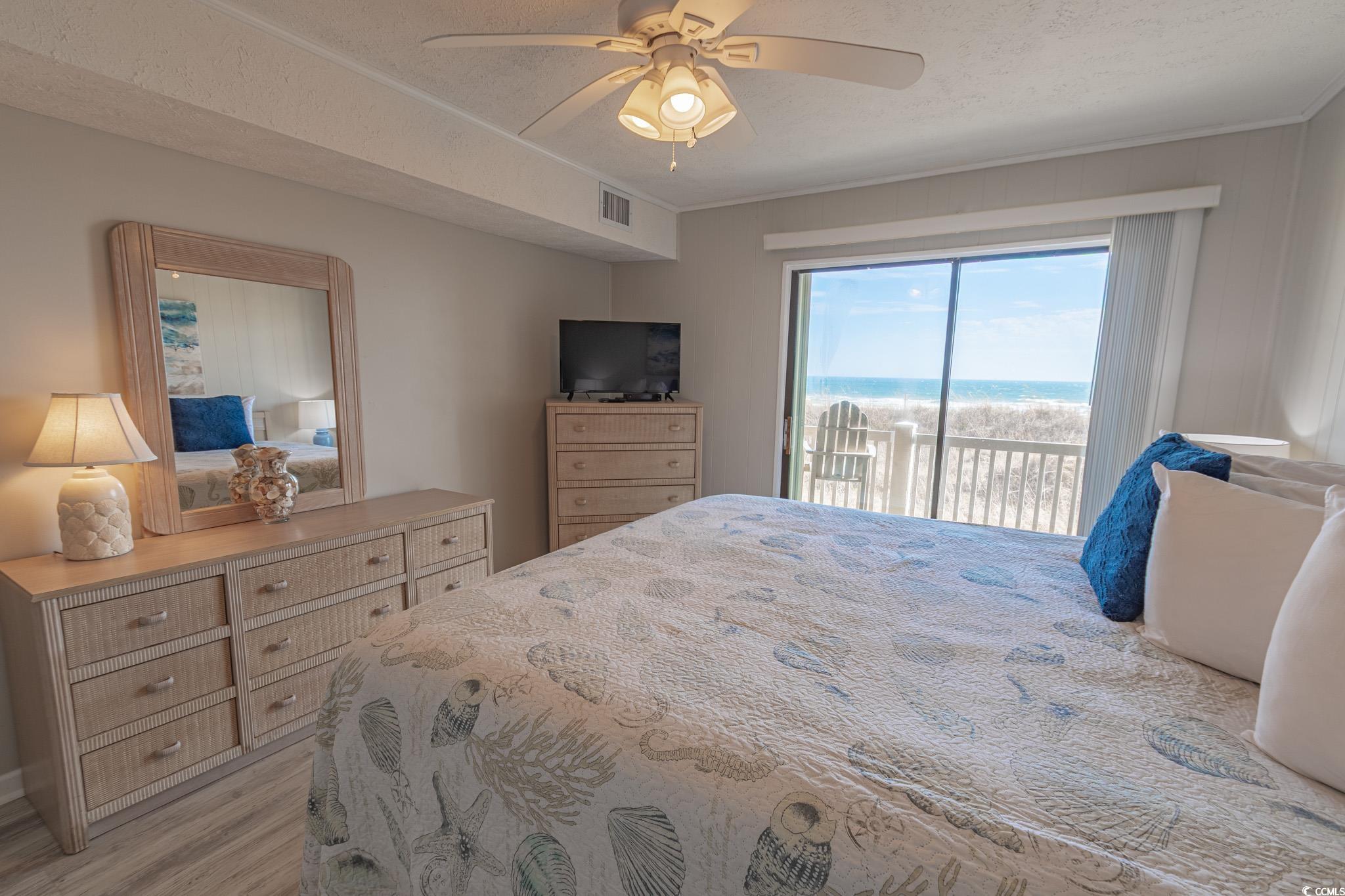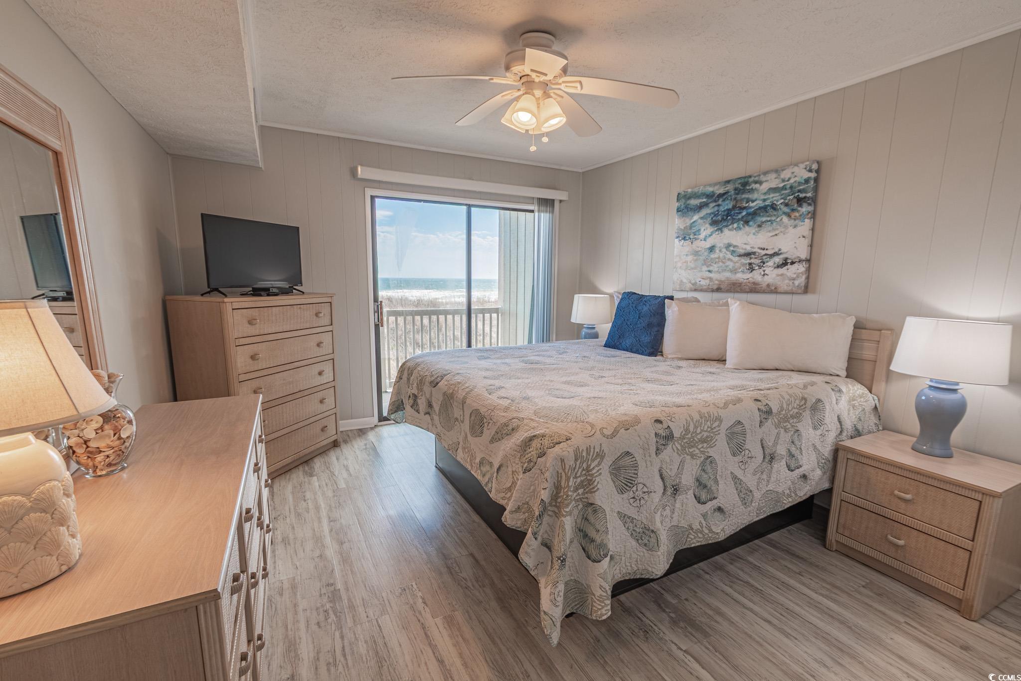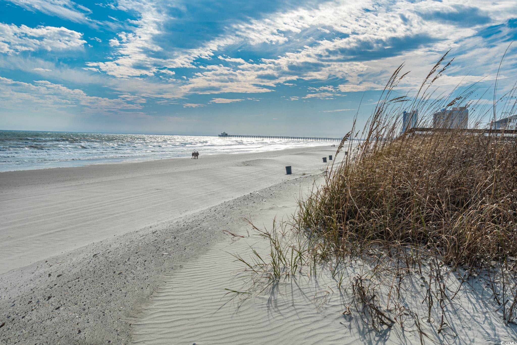 Oceanfront two bedroom, one and a half bath unit at Kings View Villas in Cherry Grove! This beautifully updated condo features LVP flooring throughout, a modern kitchen with stainless steel appliances, granite countertops, a stylish backsplash, and a convenient eat-at bar. Enjoy breathtaking beach views from the living room, which includes a ceiling fan for added comfort. Both bedrooms have ceiling fans and share a full-size hallway bath, while the oceanfront primary bedroom boasts a private half bath and stunning coastal views. Step onto the spacious covered balcony from either the living room or primary bedroom and soak in the sights and sounds of the Atlantic Ocean. Additional highlights include a stackable washer and dryer, a linen closet, and attached storage. This fully furnished unit is move-in ready! Kings View Villas offers private beach access, a pool, two grilling areas, an outdoor shower, and is conveniently located near dining, shopping, and entertainment. Square footage is approximate; buyers should verify.