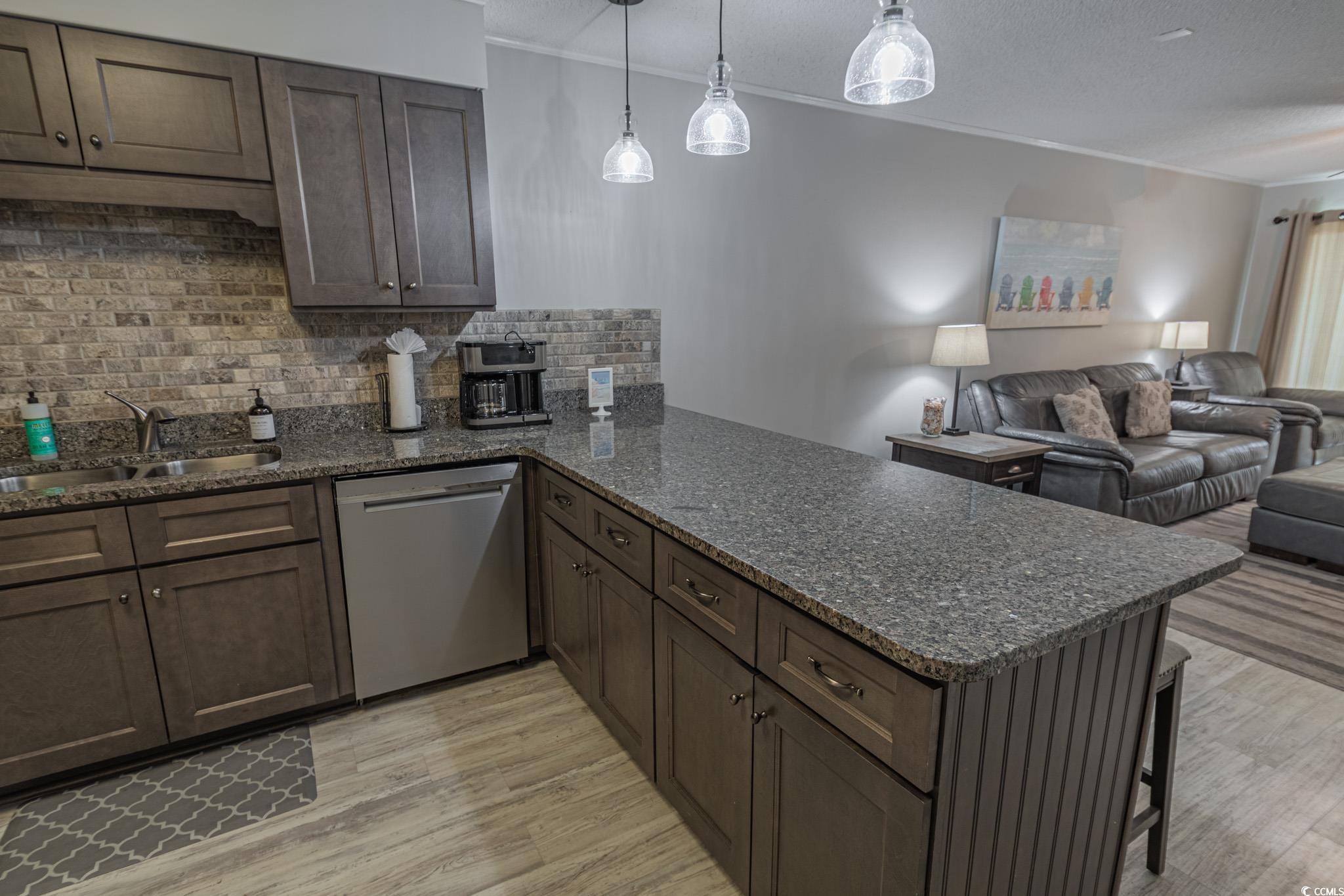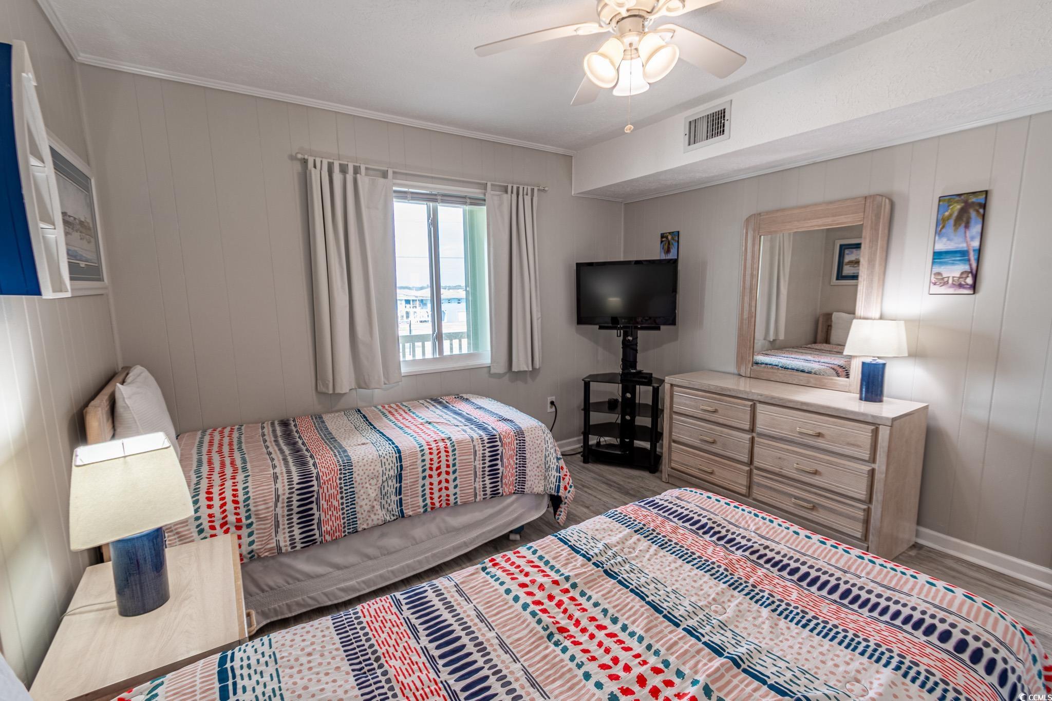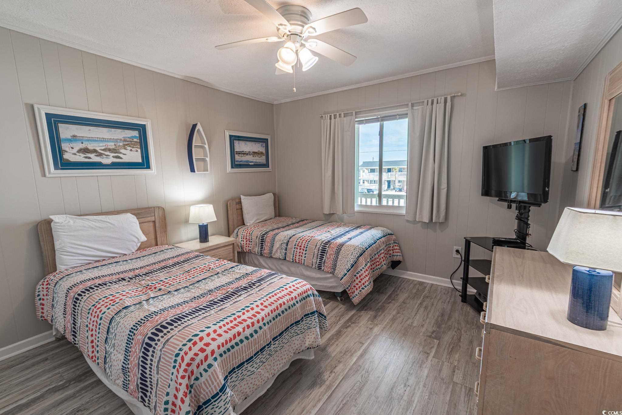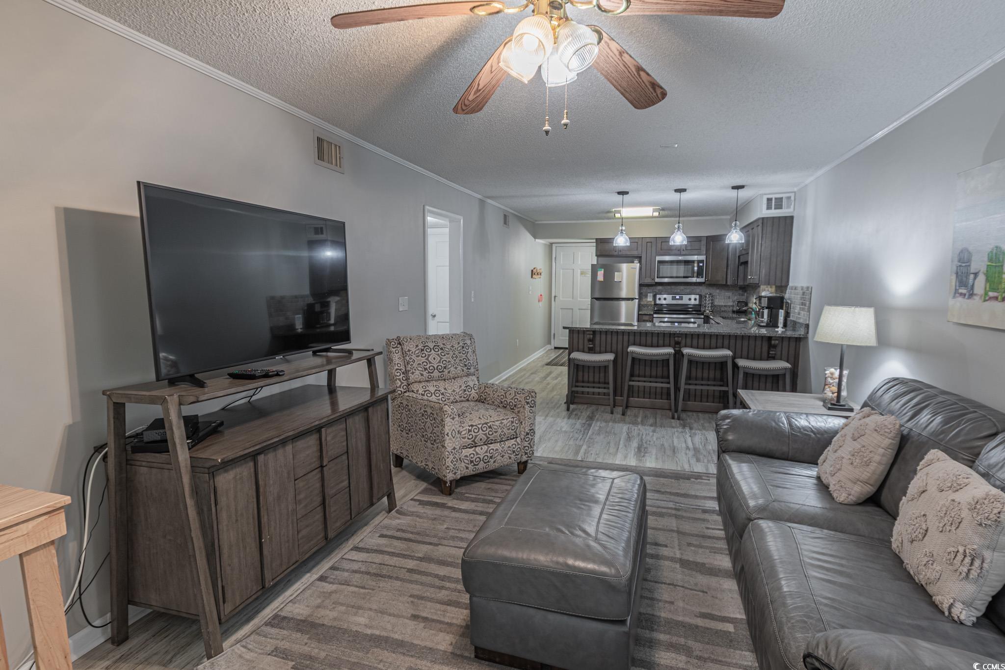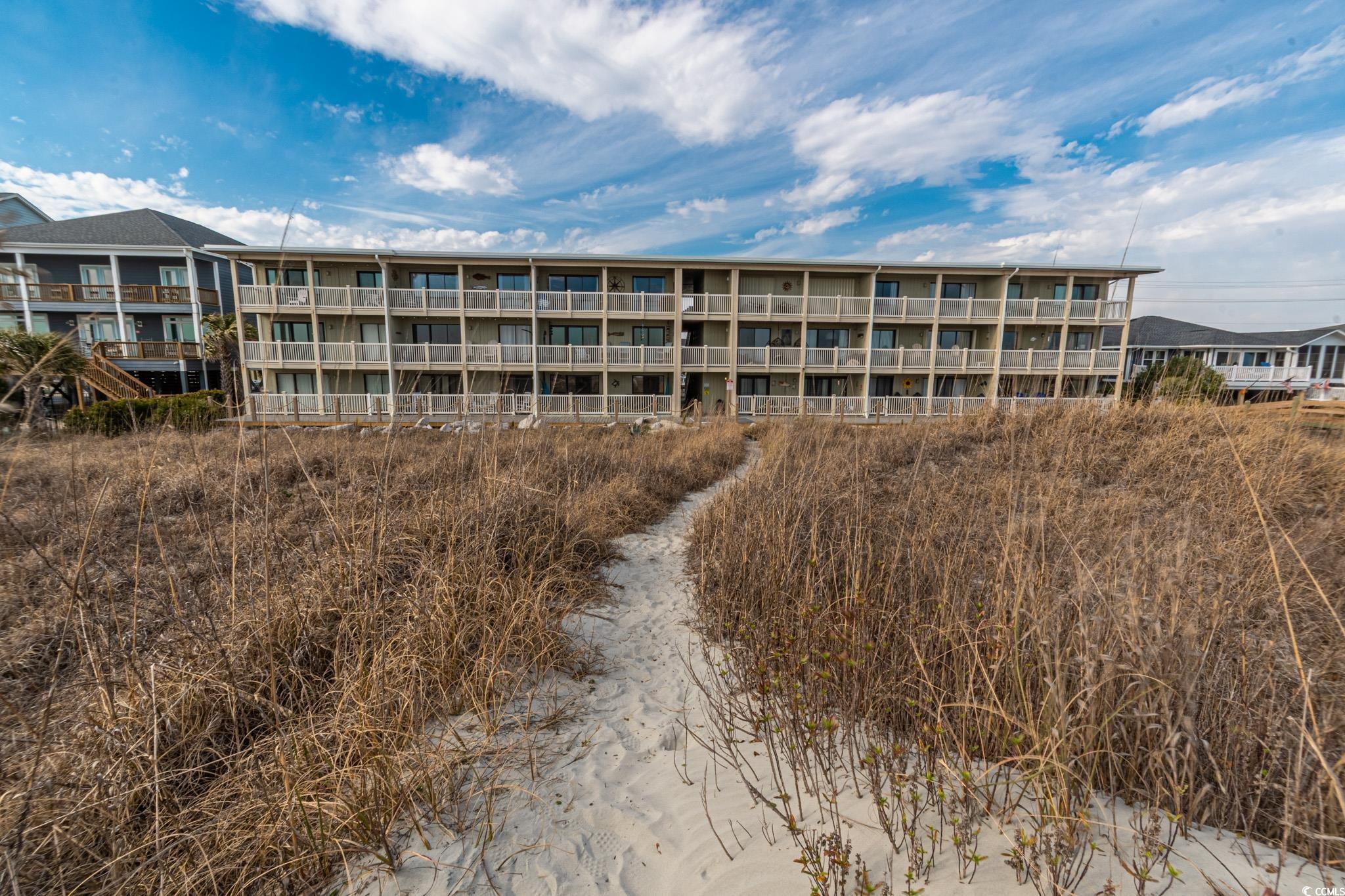 Oceanfront two bedroom, one and a half bath unit at Kings View Villas in Cherry Grove! This beautifully updated condo features LVP flooring throughout, a modern kitchen with stainless steel appliances, granite countertops, a stylish backsplash, and a convenient eat-at bar. Enjoy breathtaking beach views from the living room, which includes a ceiling fan for added comfort. Both bedrooms have ceiling fans and share a full-size hallway bath, while the oceanfront primary bedroom boasts a private half bath and stunning coastal views. Step onto the spacious covered balcony from either the living room or primary bedroom and soak in the sights and sounds of the Atlantic Ocean. Additional highlights include a stackable washer and dryer, a linen closet, and attached storage. This fully furnished unit is move-in ready! Kings View Villas offers private beach access, a pool, two grilling areas, an outdoor shower, and is conveniently located near dining, shopping, and entertainment. Square footage is approximate; buyers should verify.