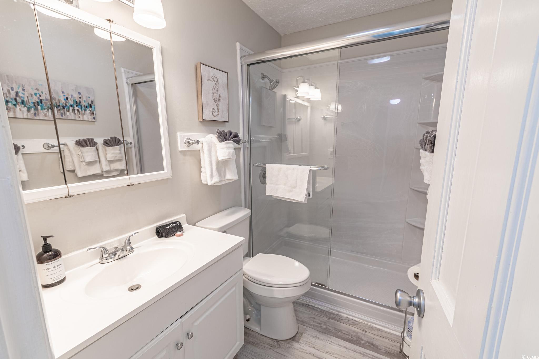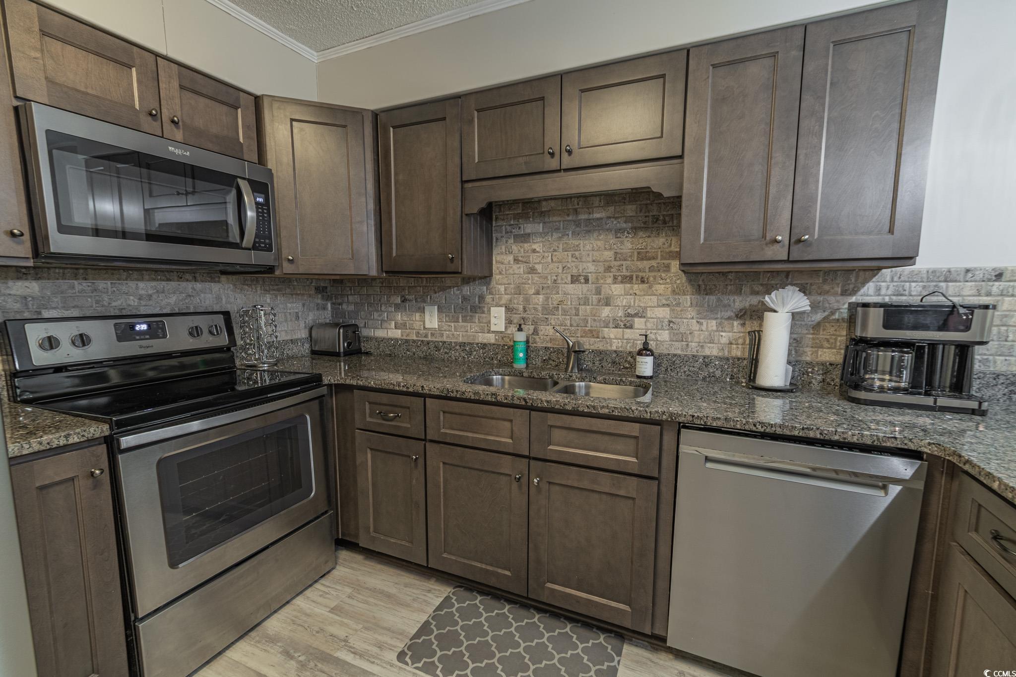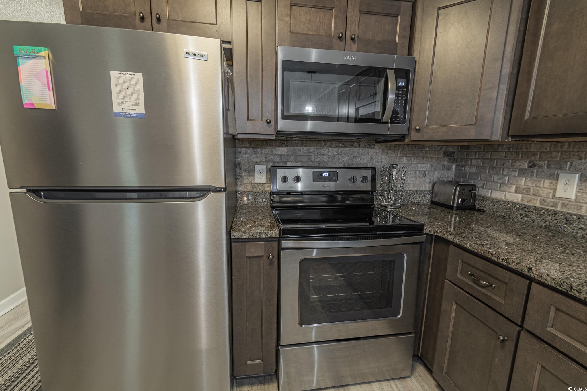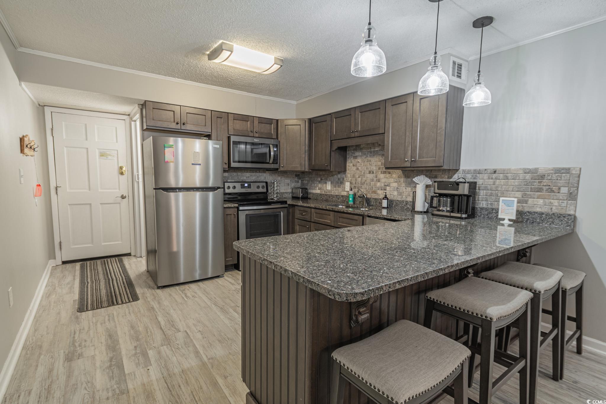 Oceanfront two bedroom, one and a half bath unit at Kings View Villas in Cherry Grove! This beautifully updated condo features LVP flooring throughout, a modern kitchen with stainless steel appliances, granite countertops, a stylish backsplash, and a convenient eat-at bar. Enjoy breathtaking beach views from the living room, which includes a ceiling fan for added comfort. Both bedrooms have ceiling fans and share a full-size hallway bath, while the oceanfront primary bedroom boasts a private half bath and stunning coastal views. Step onto the spacious covered balcony from either the living room or primary bedroom and soak in the sights and sounds of the Atlantic Ocean. Additional highlights include a stackable washer and dryer, a linen closet, and attached storage. This fully furnished unit is move-in ready! Kings View Villas offers private beach access, a pool, two grilling areas, an outdoor shower, and is conveniently located near dining, shopping, and entertainment. Square footage is approximate; buyers should verify.