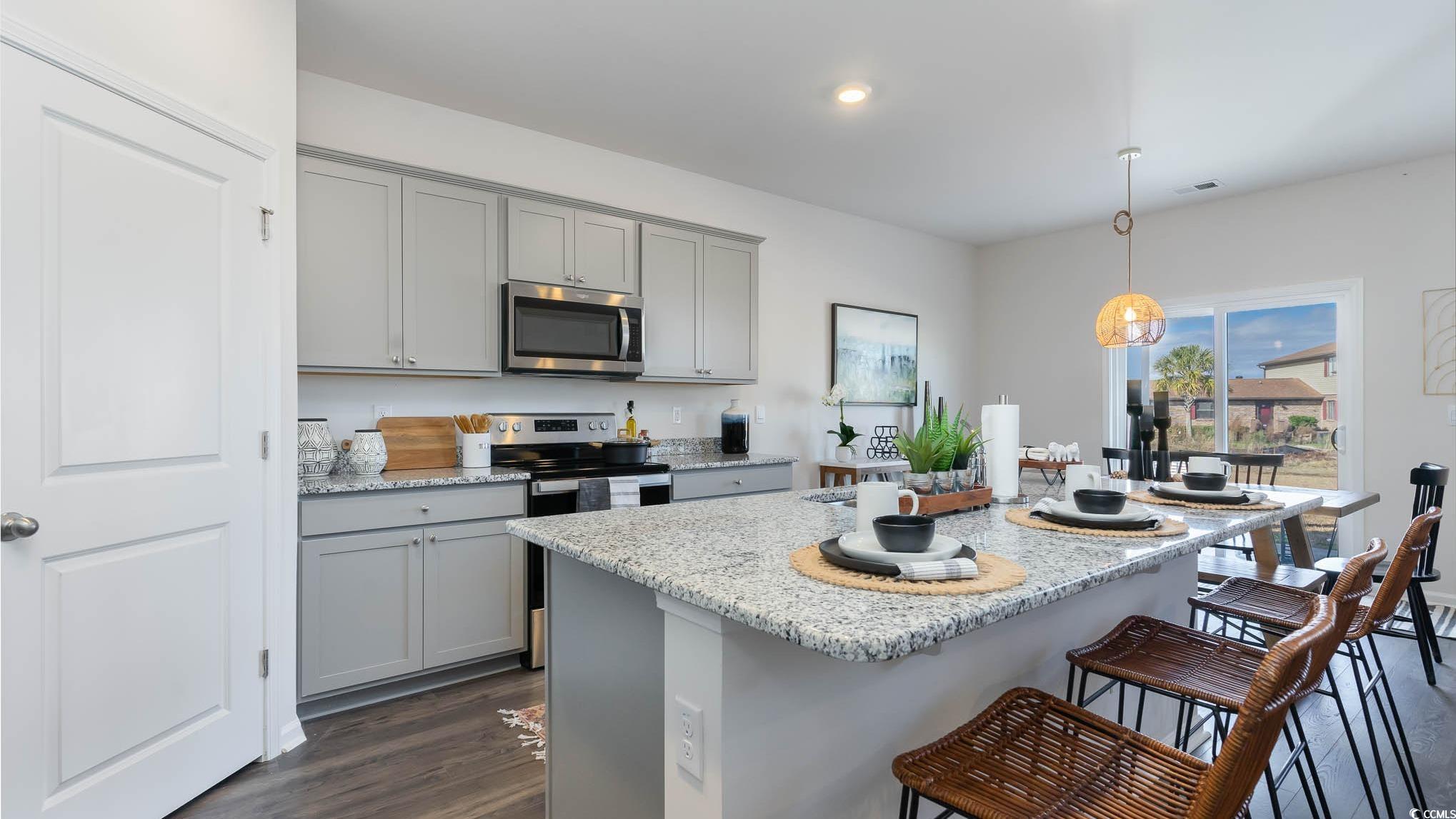 Range, Work Island, Dishwasher, Garbage Disposal, Microwave, Breakfast Bar, Pantry, Stainless Steel Apps., Solid Surface Countertops
