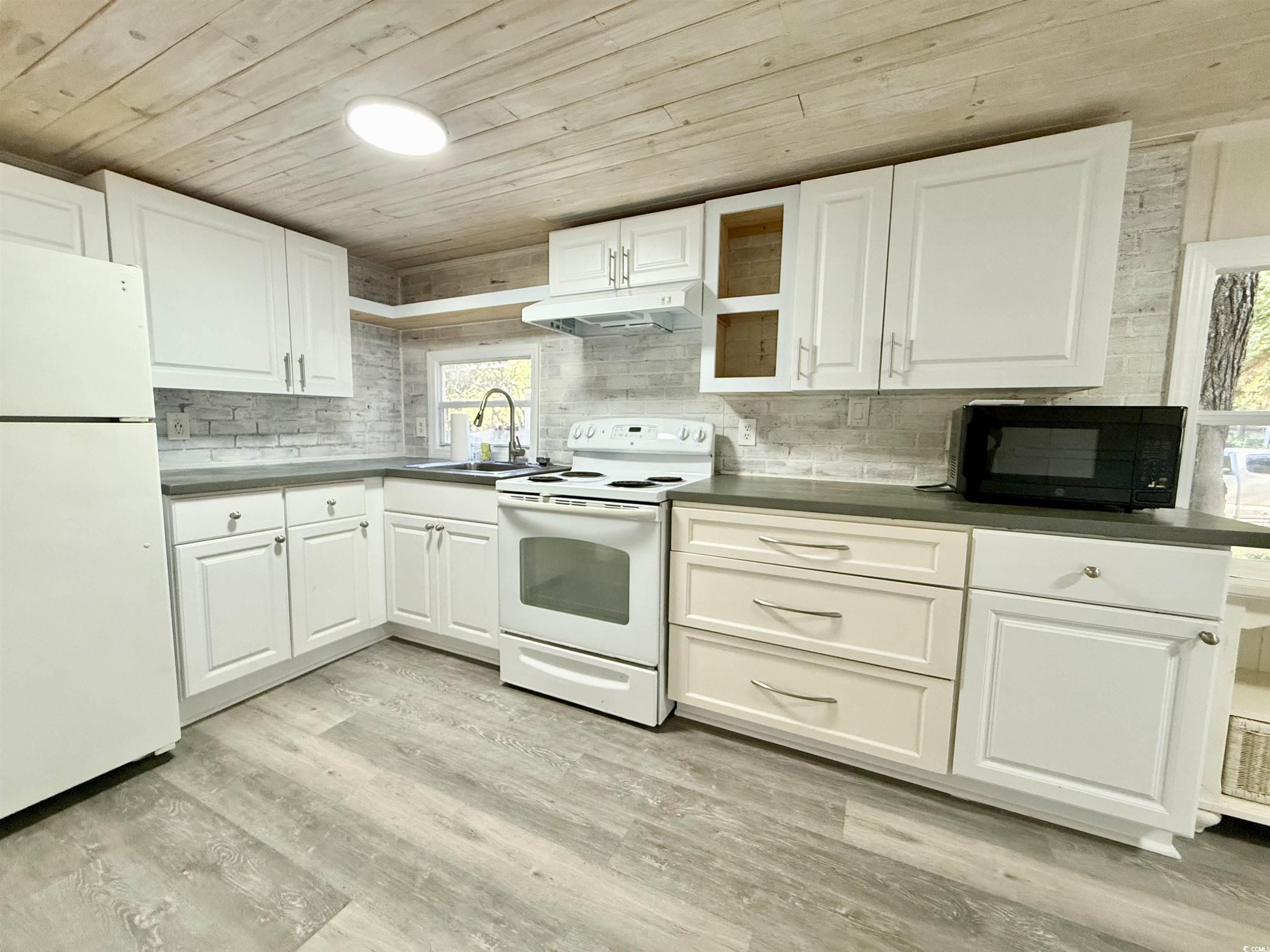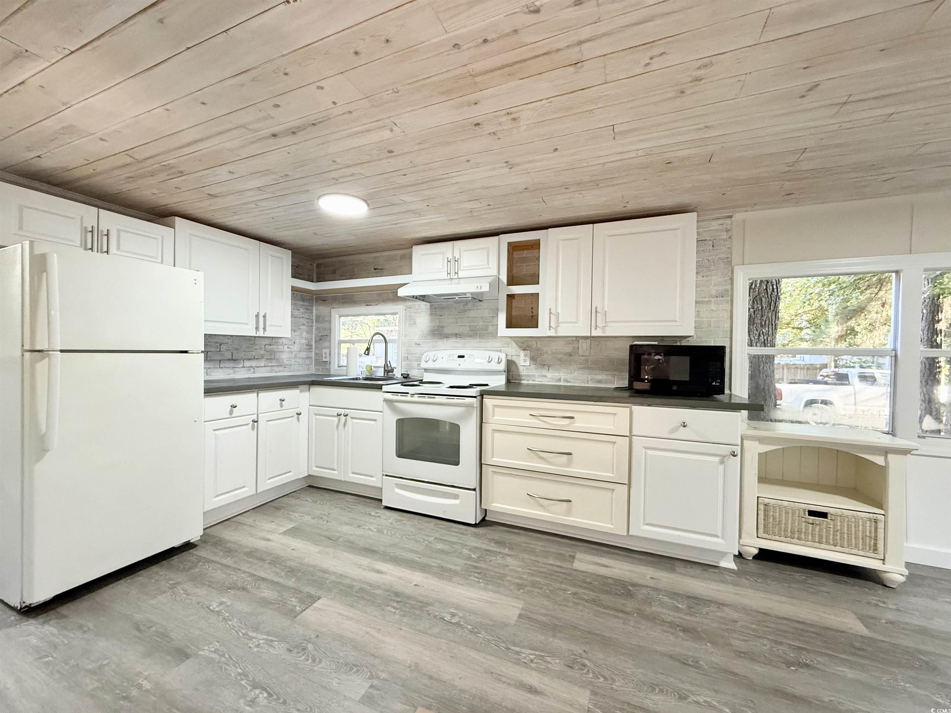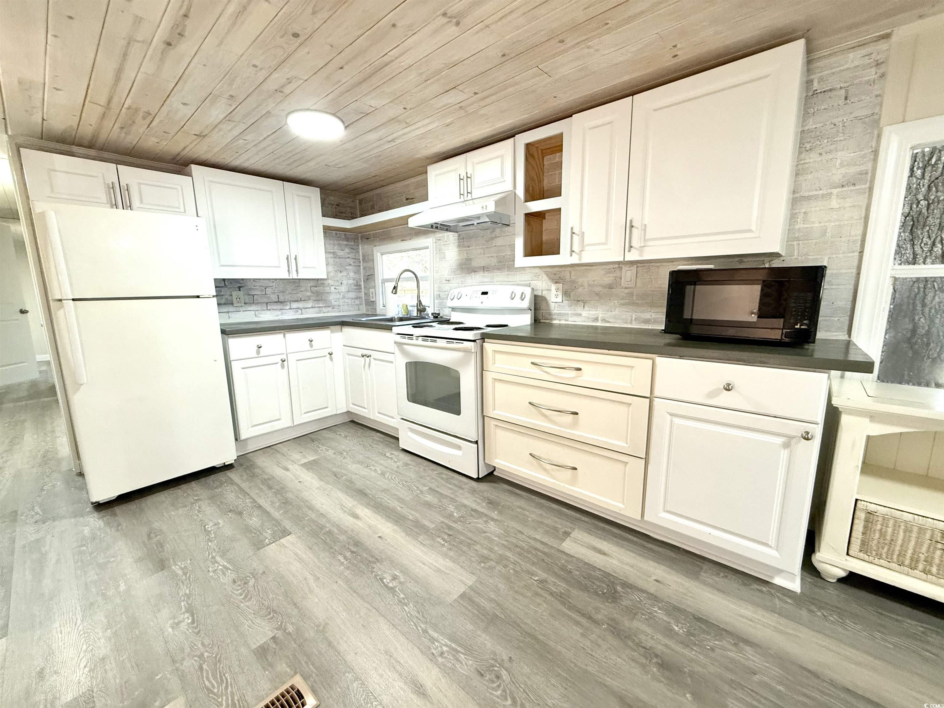 Discover affordable coastal living in this inviting 2 bedroom, 1 bath manufactured home. Thoughtfully updated with fresh finishes and modern touches, it’s the perfect place to relax, unwind, and enjoy life near the beach. Inside you’ll find brand new flooring throughout and stylish shiplap ceilings that add character and warmth. The bright, open living room flows into a refreshed kitchen featuring crisp white cabinetry with a blend of open and closed shelving, perfect for both storage and display. Convenience is built right in with a washer and dryer included, and there’s plenty of room for your vehicles with four car parking plus dedicated golf cart space. Out back, a concrete slab is already in place, ready for your future shed or extra storage. Located close to shopping and dining, and close enough to enjoy the sand and surf anytime, this home offers the ideal combination of comfort, convenience, and affordability. Whether you’re looking for a full time residence or a weekend retreat, this property checks all the boxes.